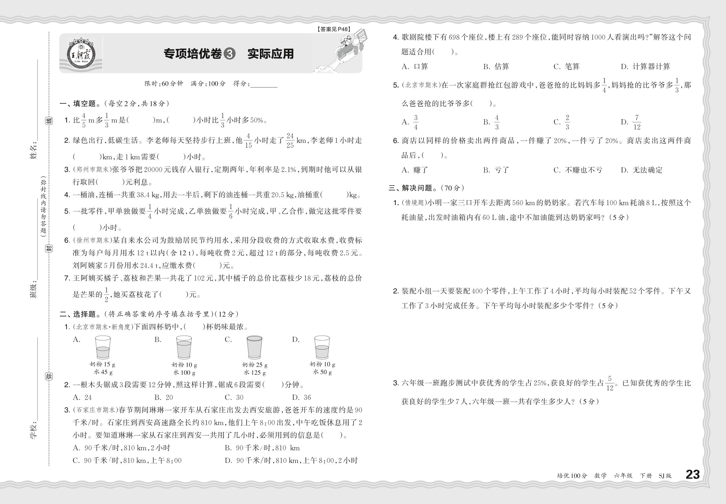 2024春下册六年级数学苏教版 期末专项卷PY版·实际应用【3】