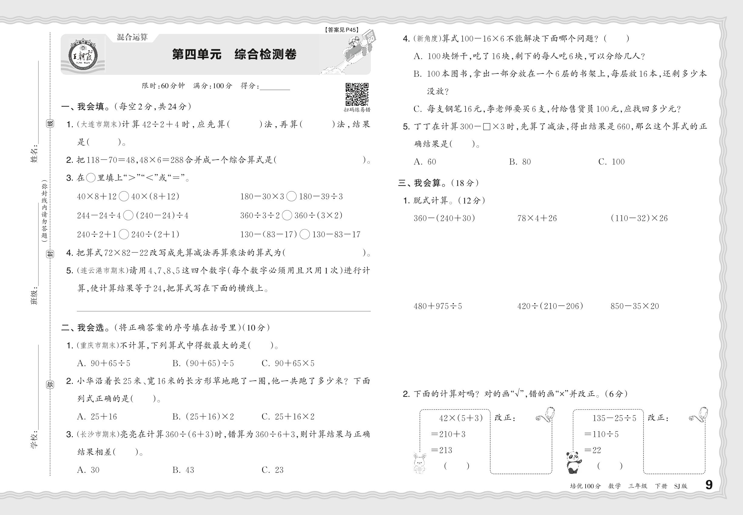 2024春下册三年级数学苏教版 第四单元 综合检测卷