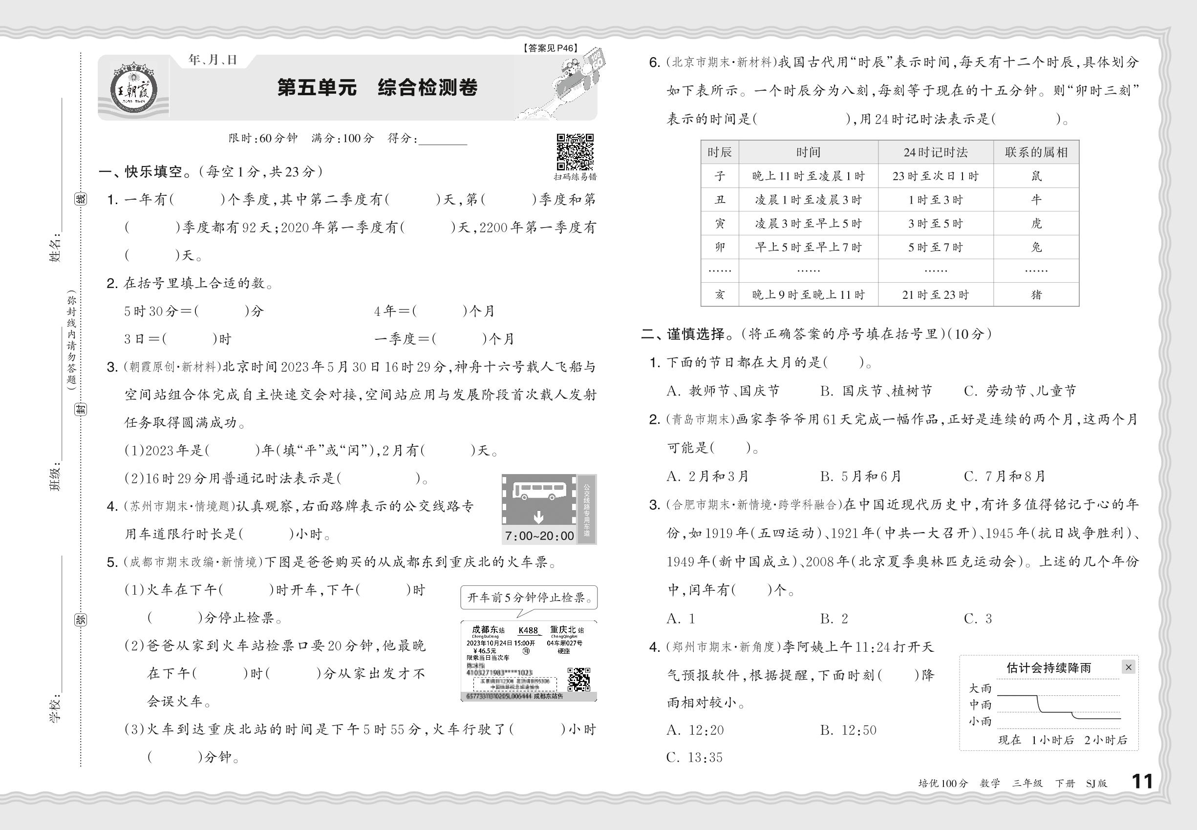 2024春下册三年级数学苏教版 第五单元 综合检测卷