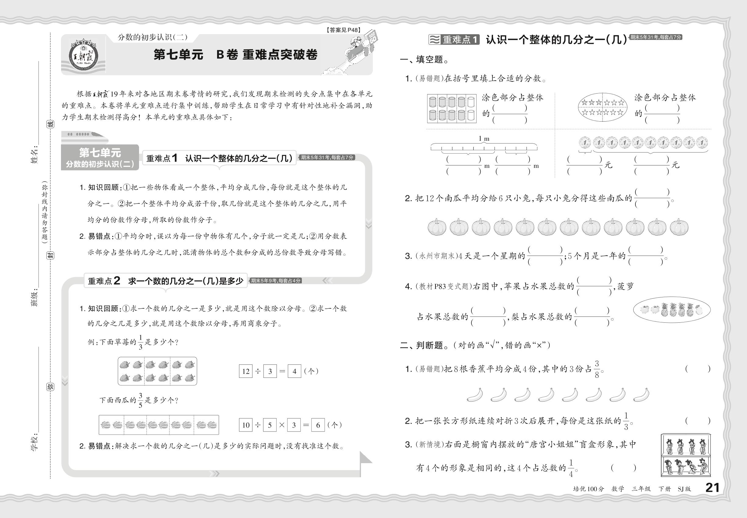 2024春下册三年级数学苏教版 第七单元 B卷 重难点突破卷