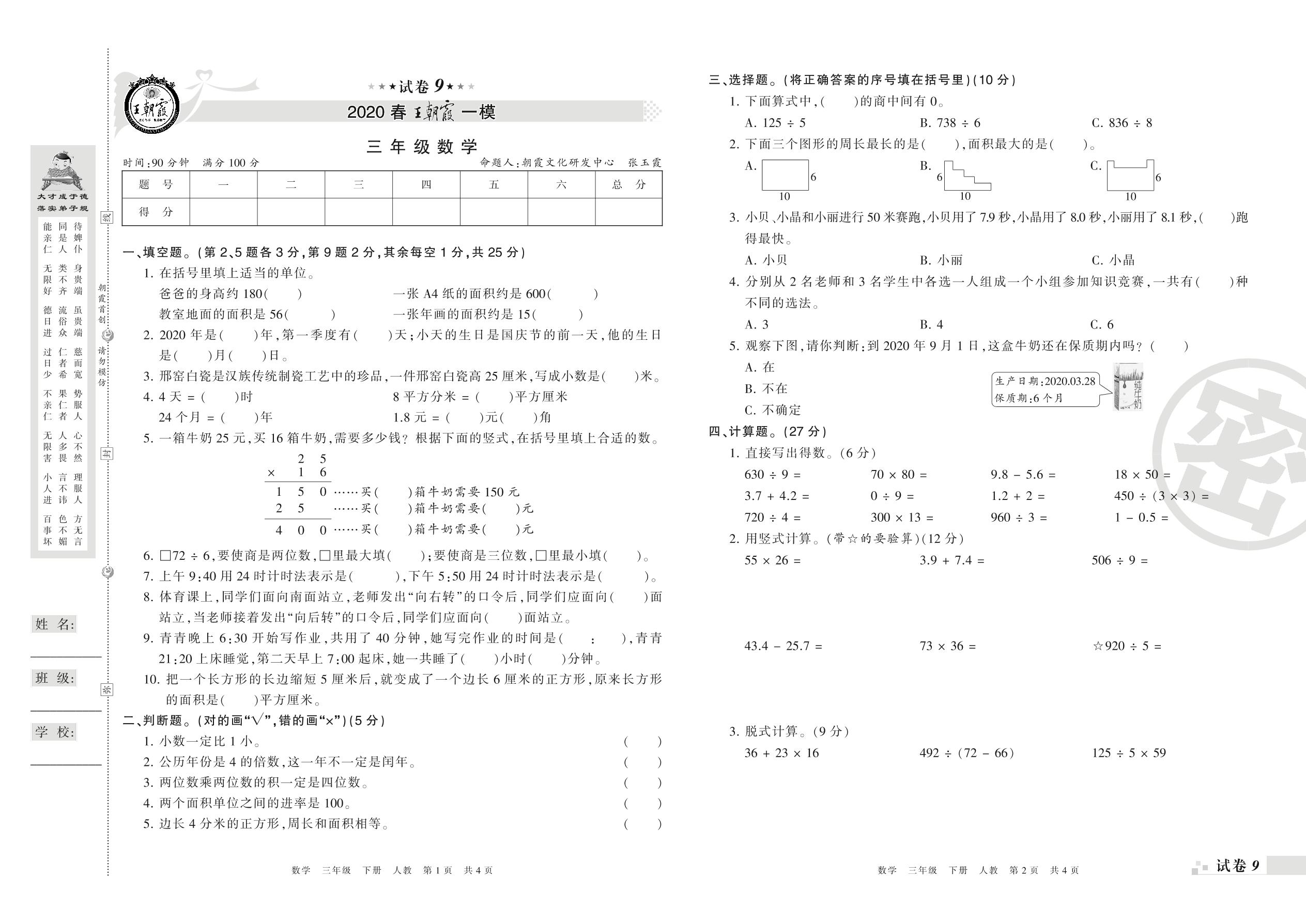 王朝霞期末模拟卷三年级下册数学(人教版)_R21080494043【9】