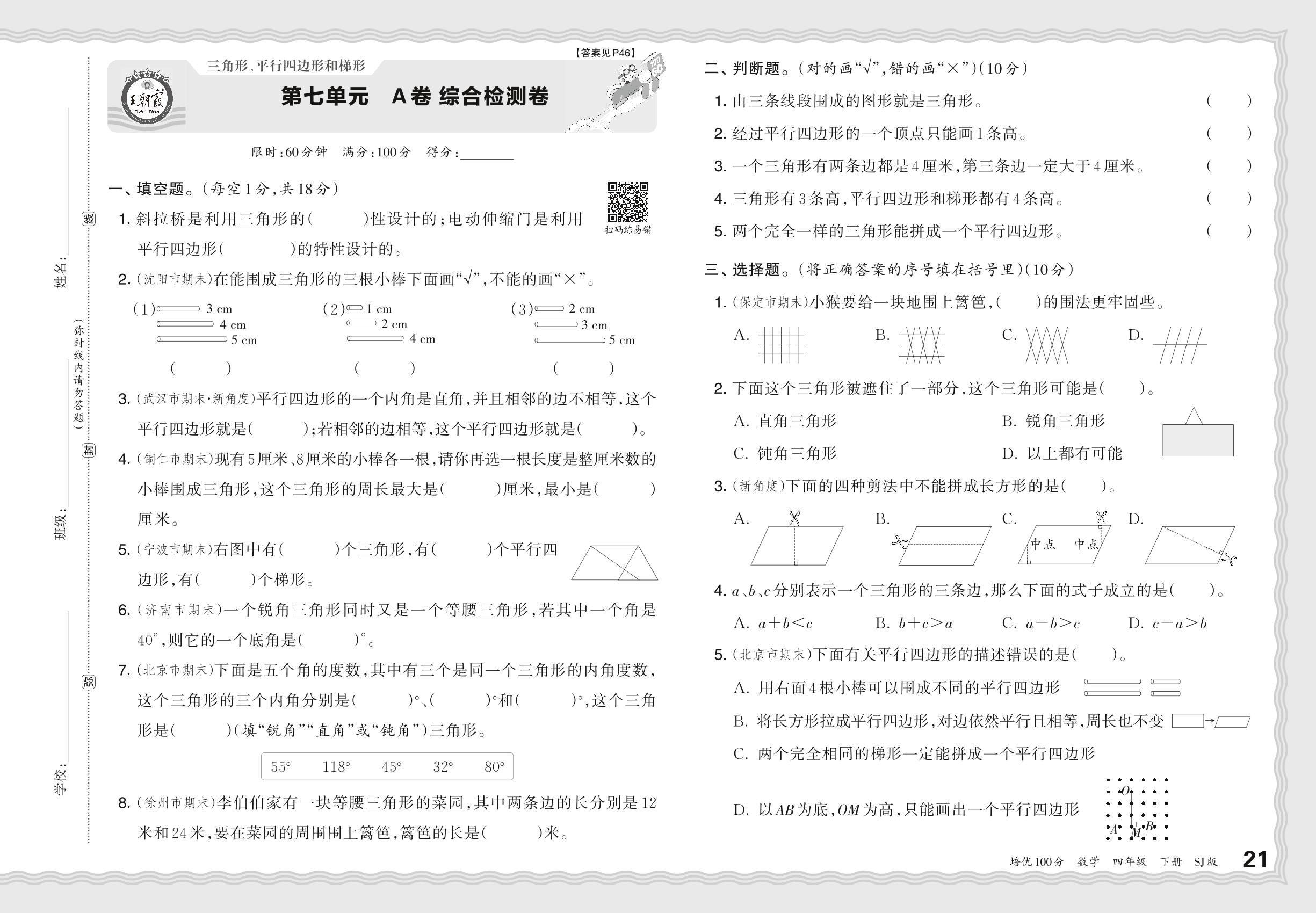 2024春下册四年级数学苏教版 第七单元 A卷 综合检测卷
