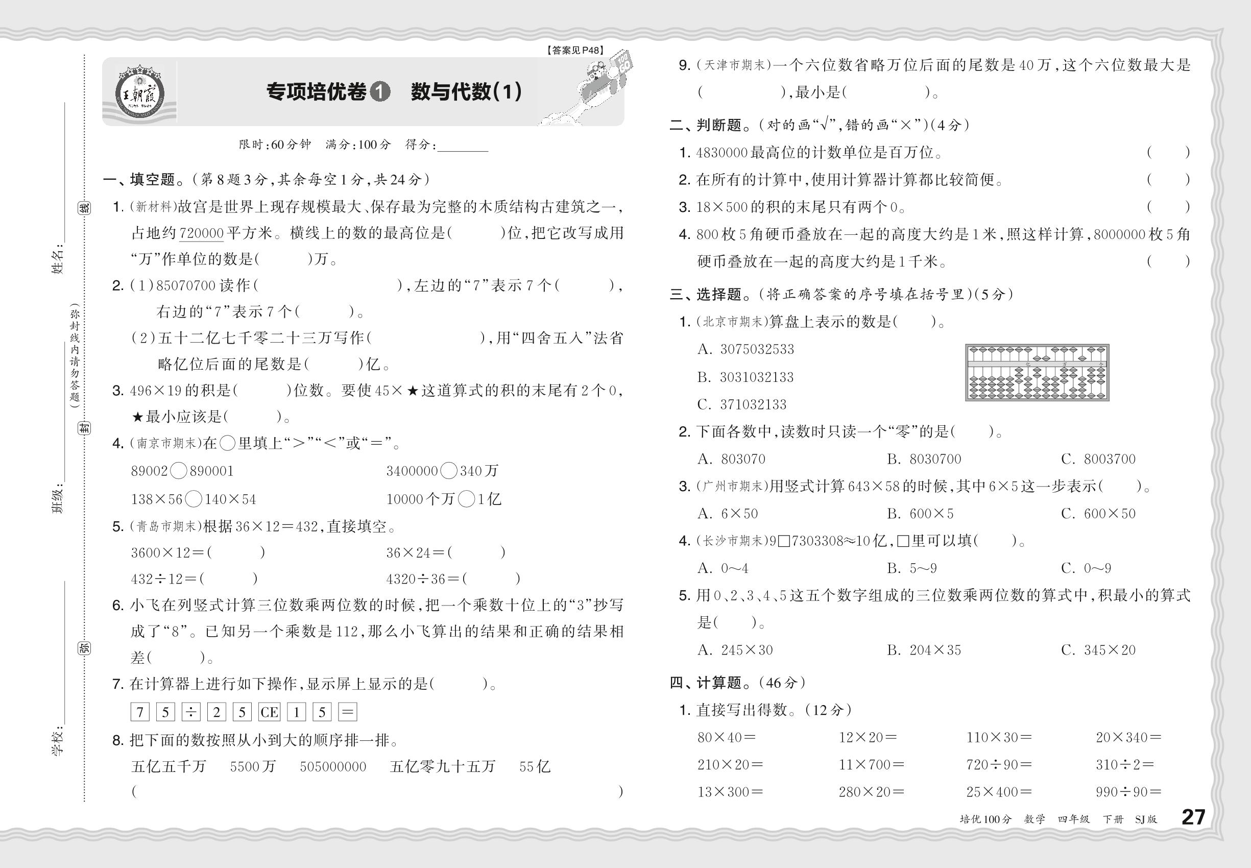2024春下册四年级数学苏教版 期末专项卷PY版·数与代数(1)【1】