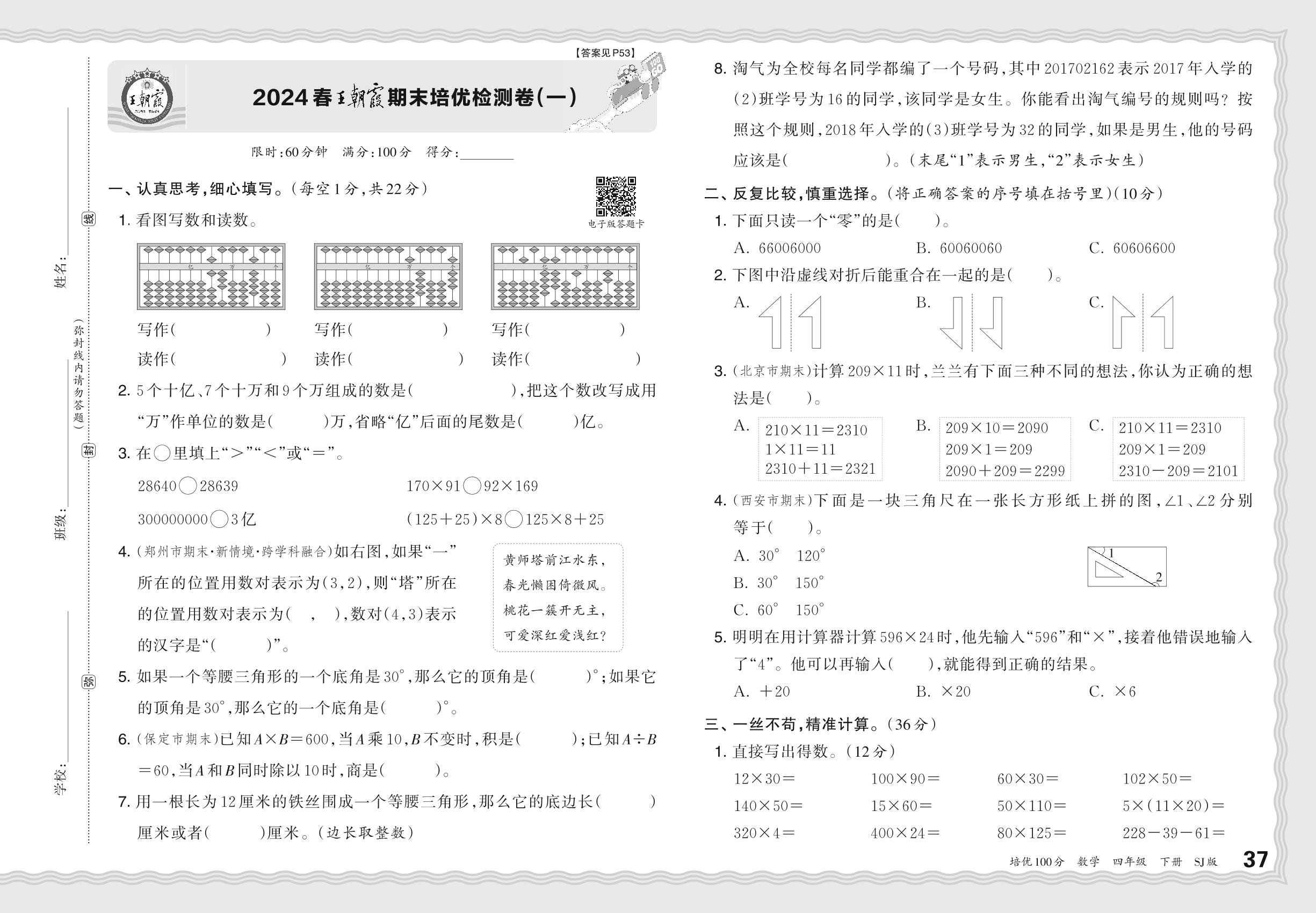 2024春下册四年级数学苏教版 王朝霞期末培优检测卷(一)
