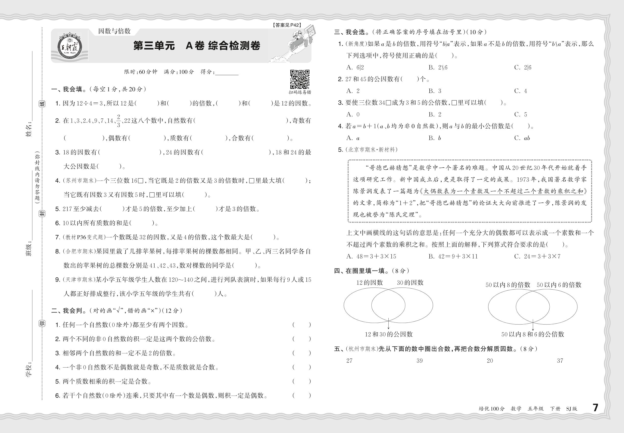 2024春下册五年级数学苏教版 第三单元 A卷 综合检测卷