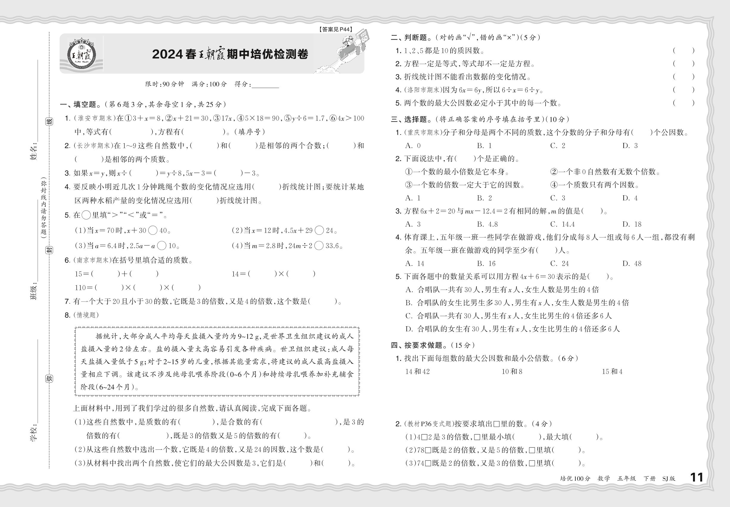 2024春下册五年级数学苏教版 王朝霞期中培优检测卷