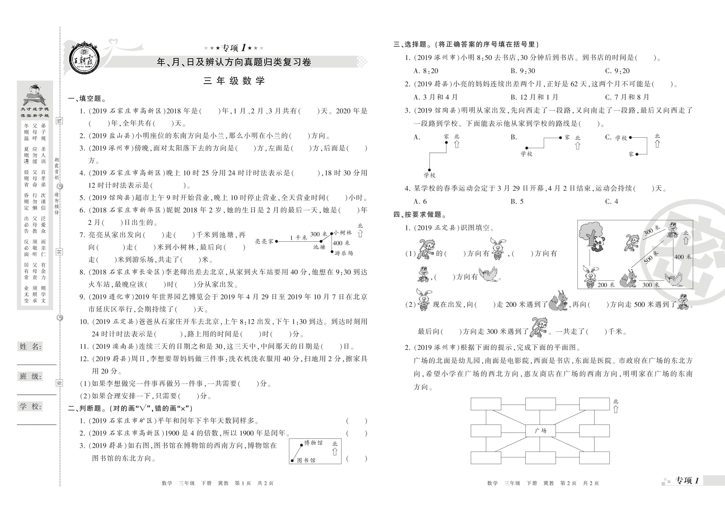 王朝霞期末专项卷——年、月、日及辨认方向、两位数乘两位数(一)真题归类复习卷三年级下册数学(冀教版)_R21080494057【0】