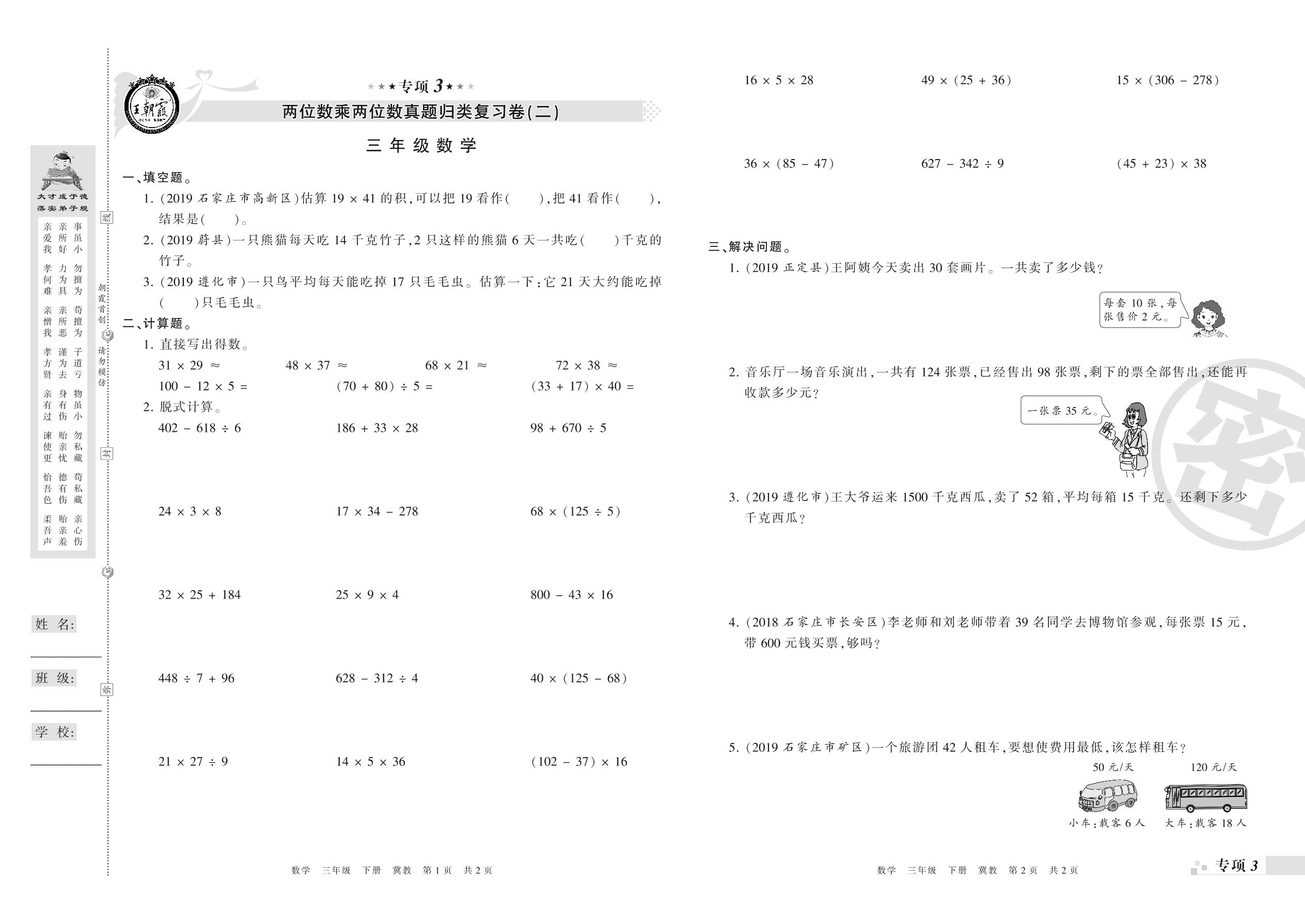王朝霞期末专项卷——两位数乘两位数(二)、毫米和千米及数据的收集和整理真题归类复习卷三年级下册数学(冀教版)_R21080494102【0】