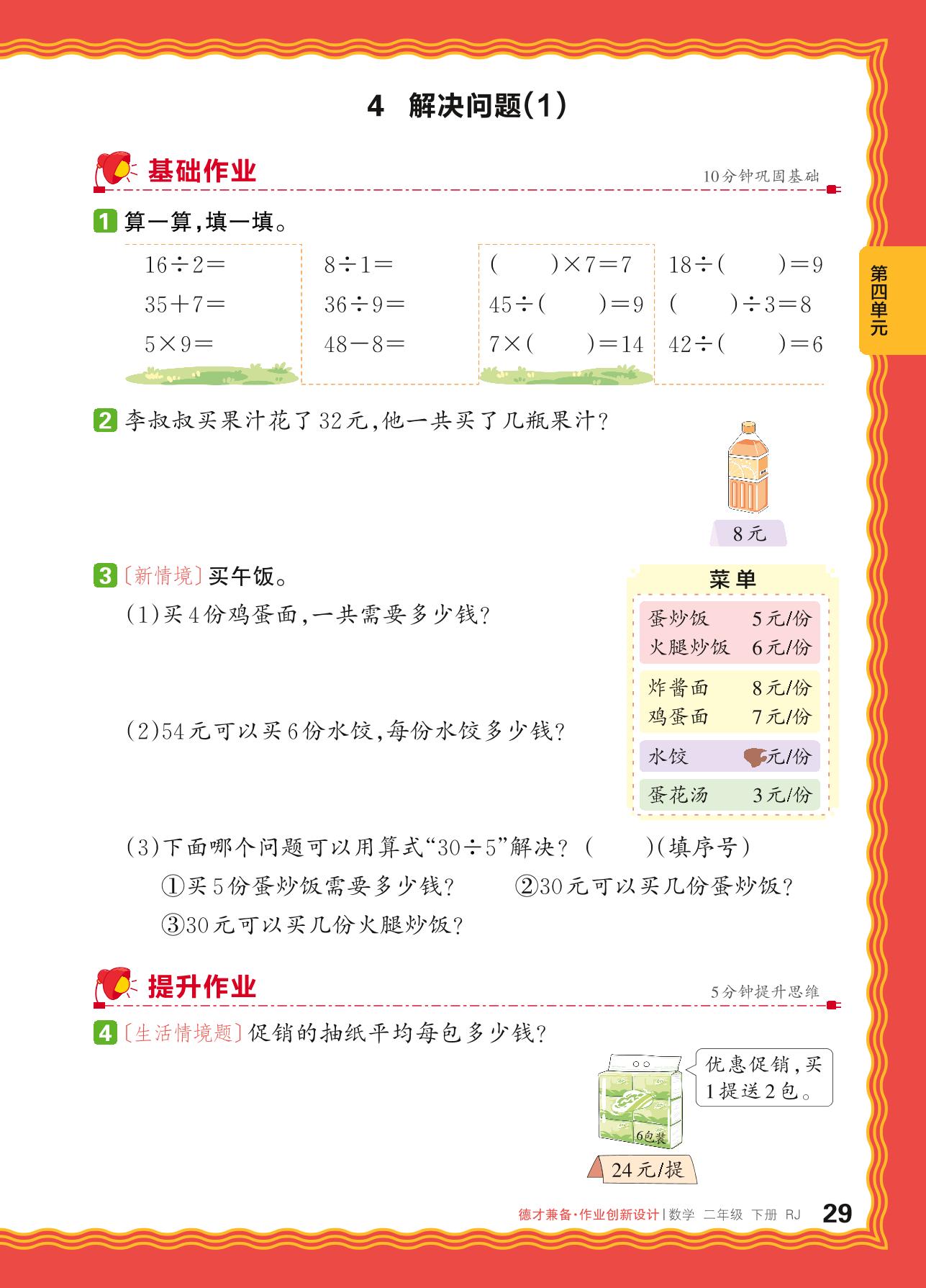 2024春下册二年级数学人教版 第四单元 表内除法(二)——4. 解决问题(1)