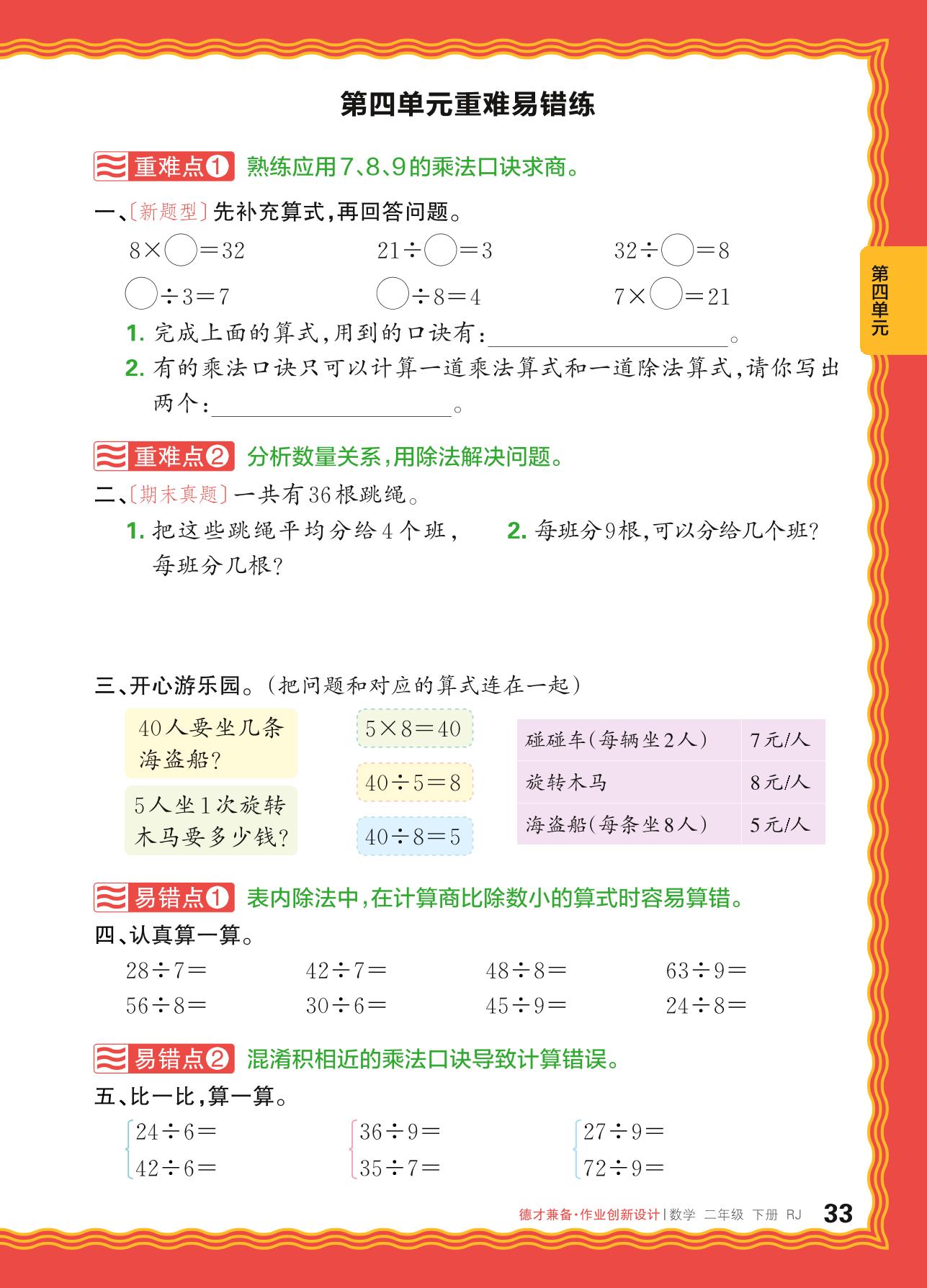2024春下册二年级数学人教版 第四单元重难易错练