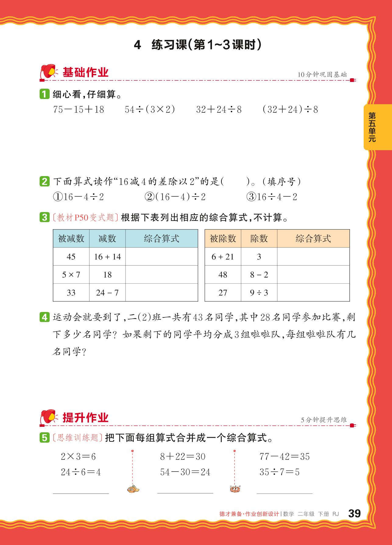 2024春下册二年级数学人教版 第五单元 混合运算——4. 没有括号的同级混合运算、没有括号的两级混合运算、带有小括号的两步混合运算练习课
