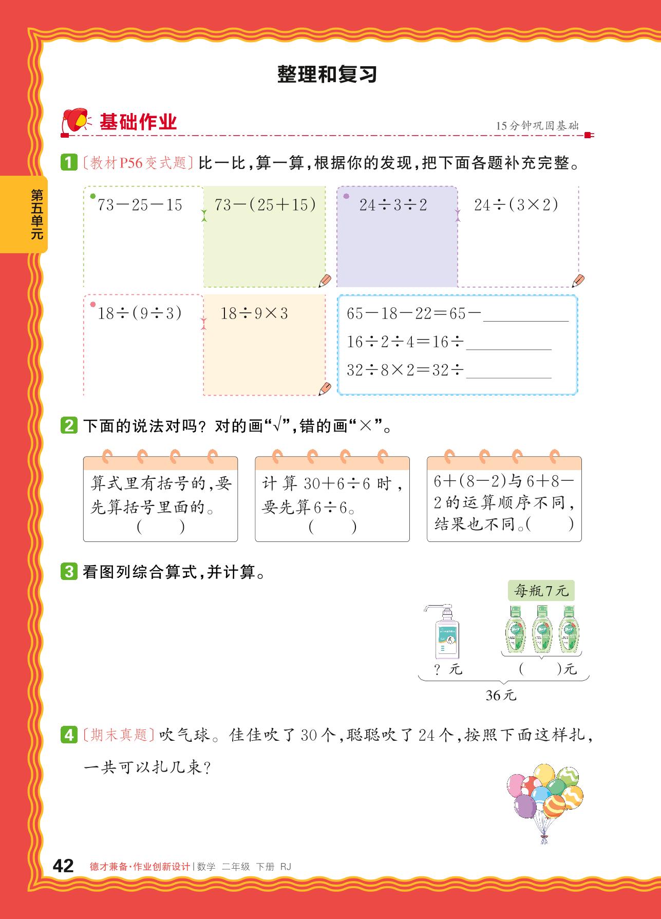 2024春下册二年级数学人教版 第五单元 混合运算——整理和复习