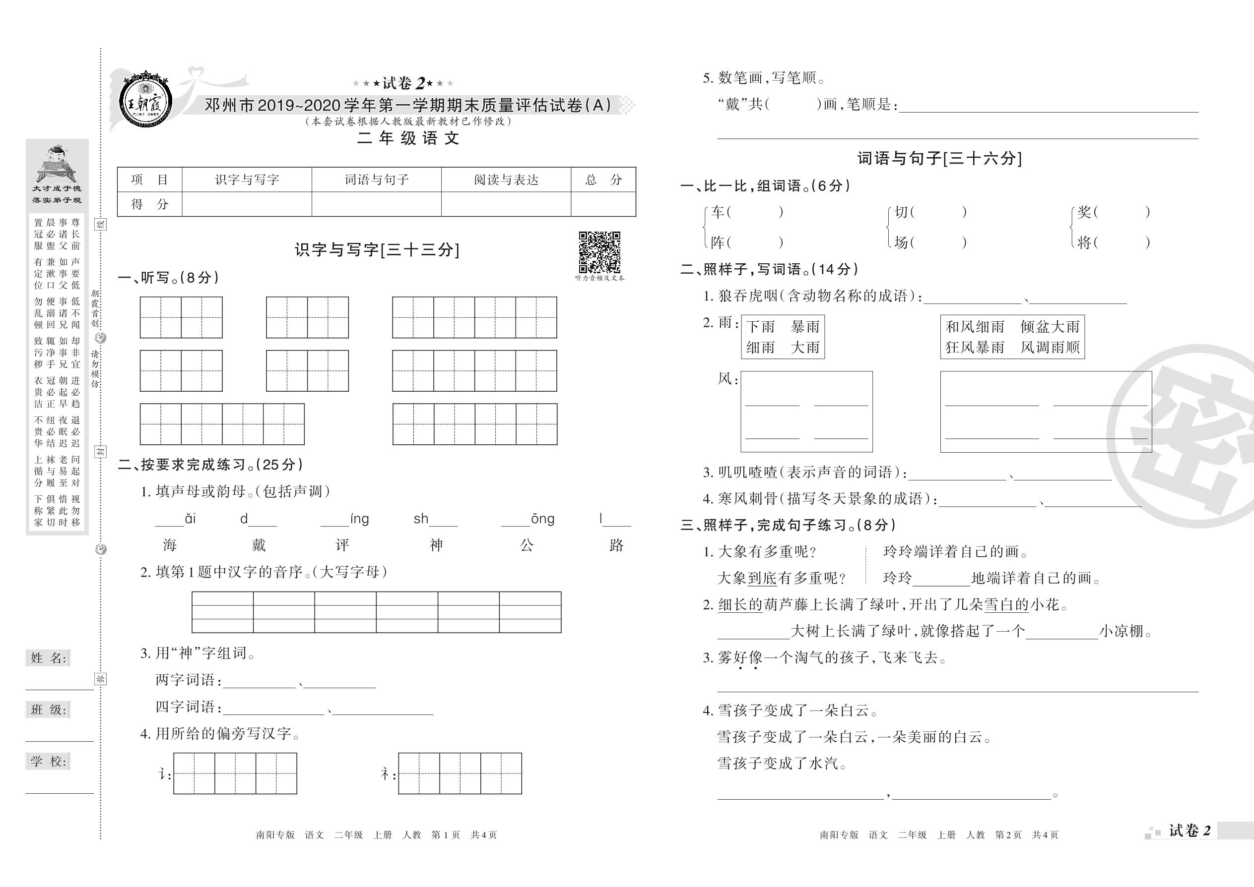 2019-2020学年第一学期邓州市二年级语文试卷(人教版)【2】