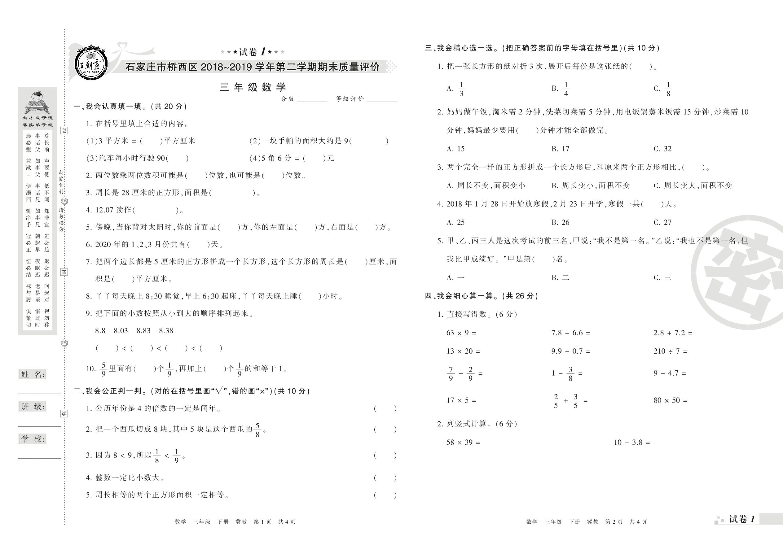 2018-2019学年第二学期石家庄市桥西区三年级数学试卷(冀教版)【1】