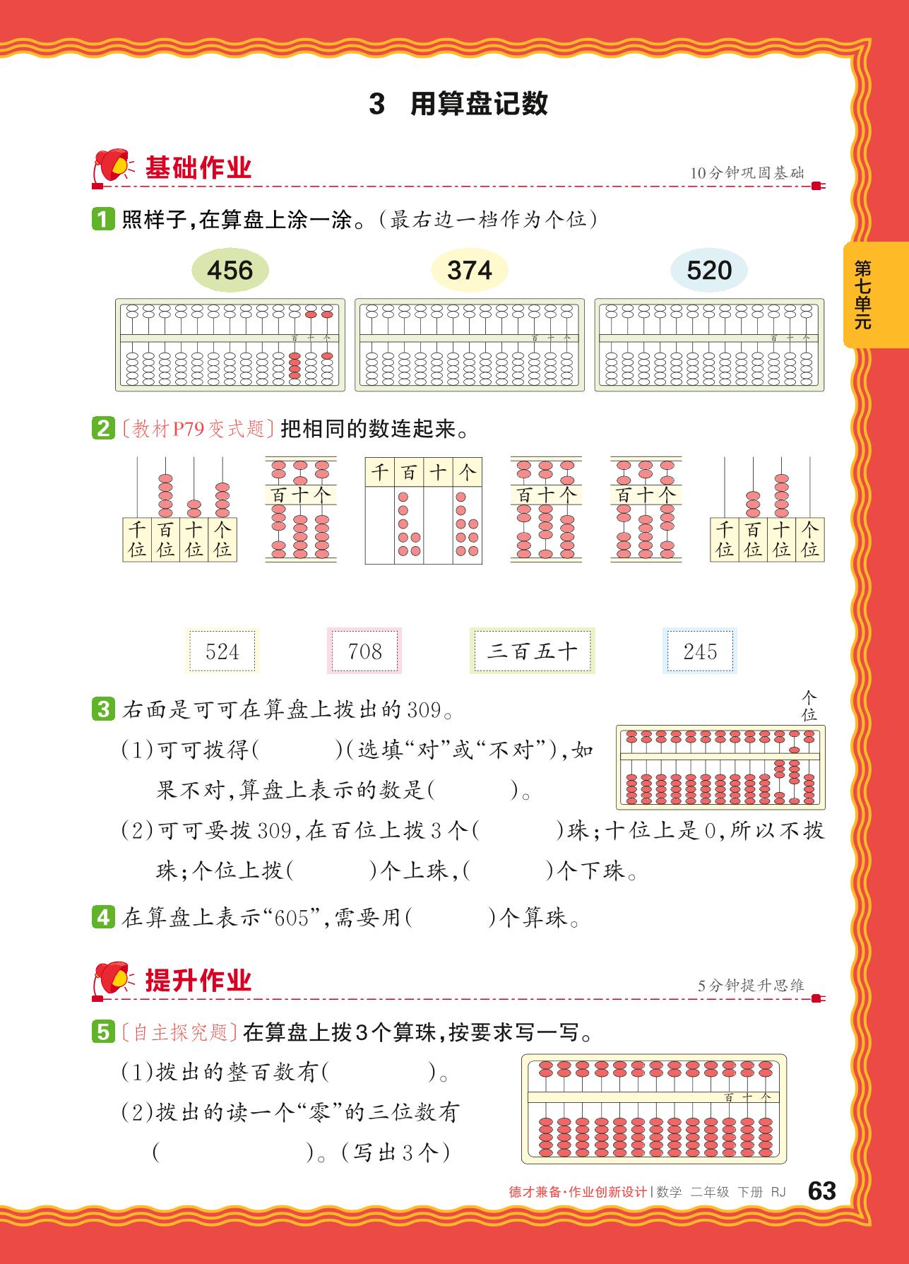 2024春下册二年级数学人教版 第七单元 万以内数的认识——3. 用算盘记数