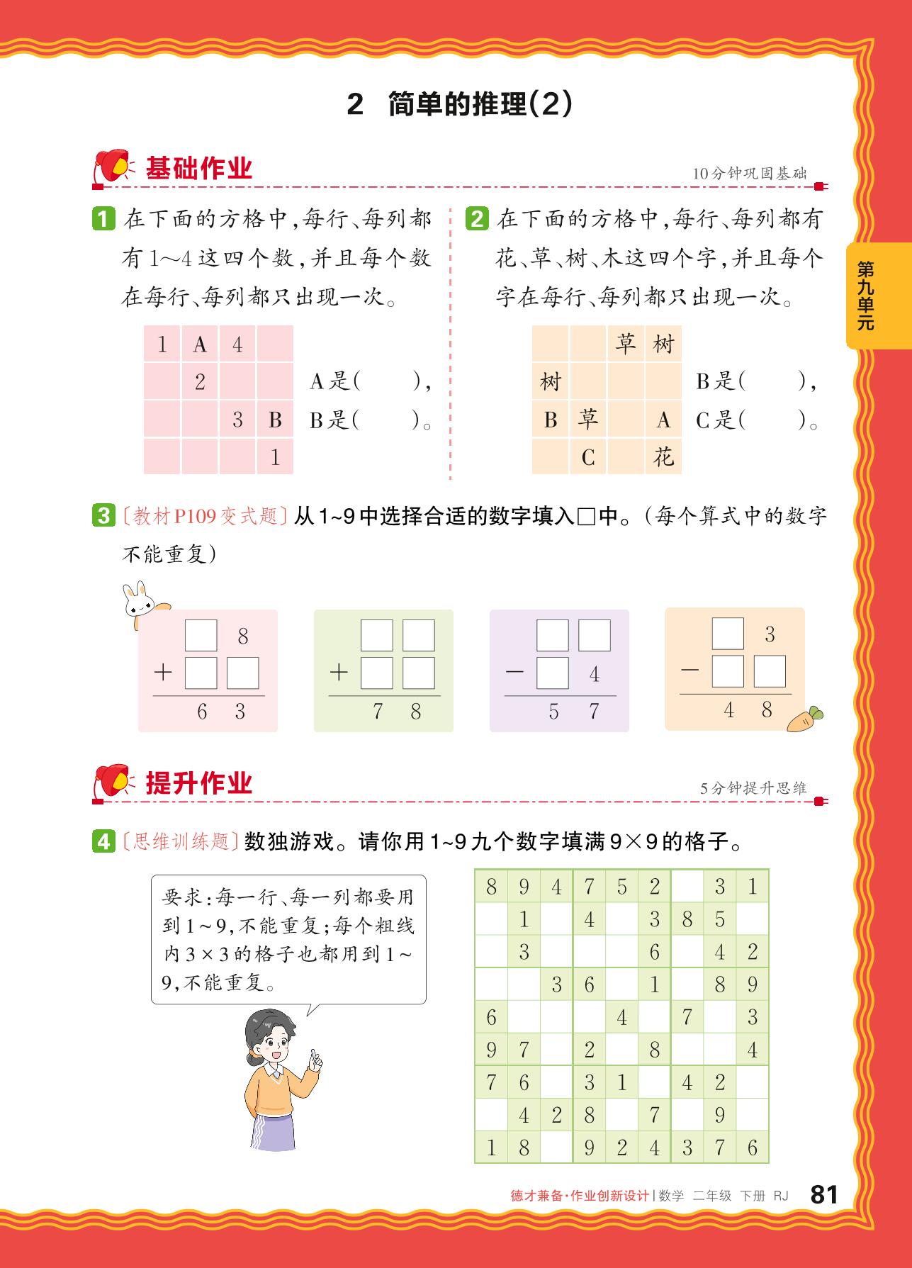 2024春下册二年级数学人教版 第九单元 数学广角——推理——2. 简单的推理(2)