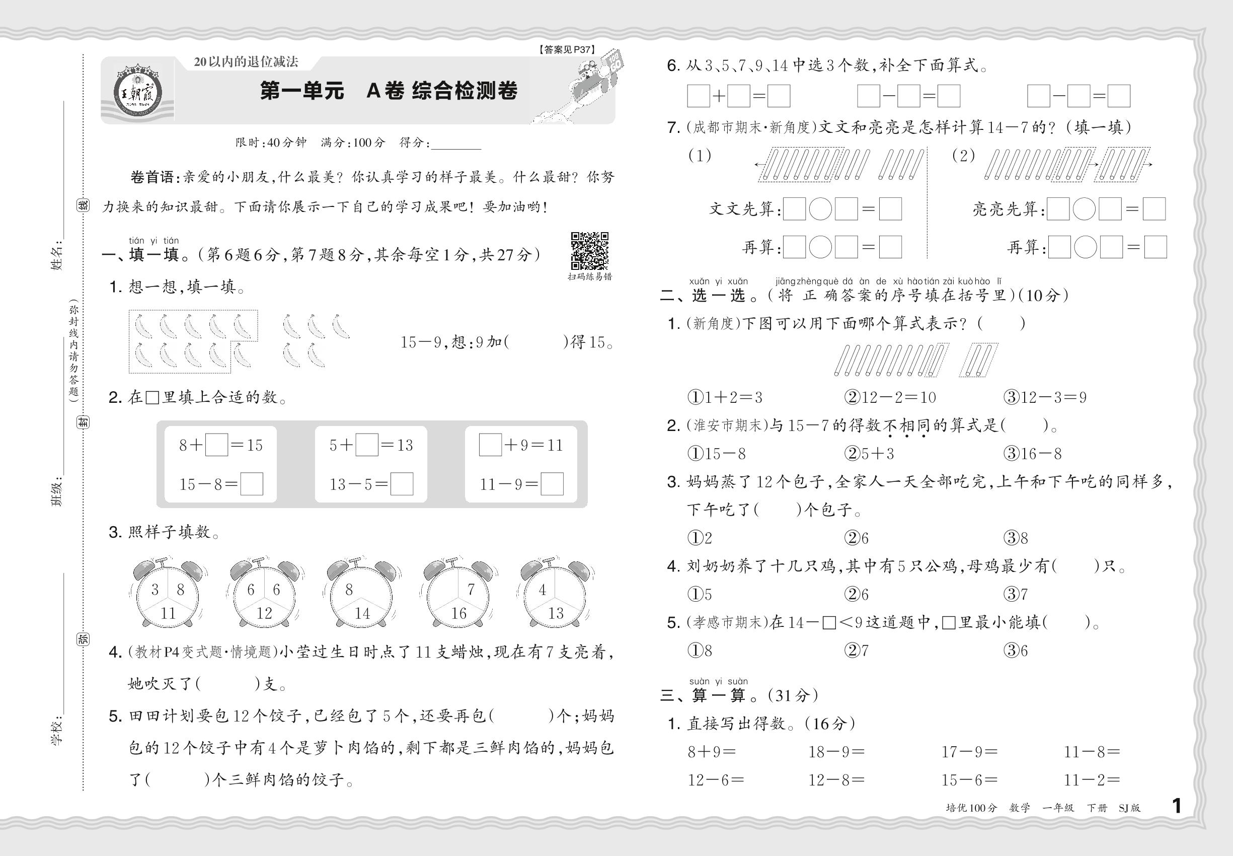 2024春下册一年级数学苏教版 第一单元 A卷 综合检测卷