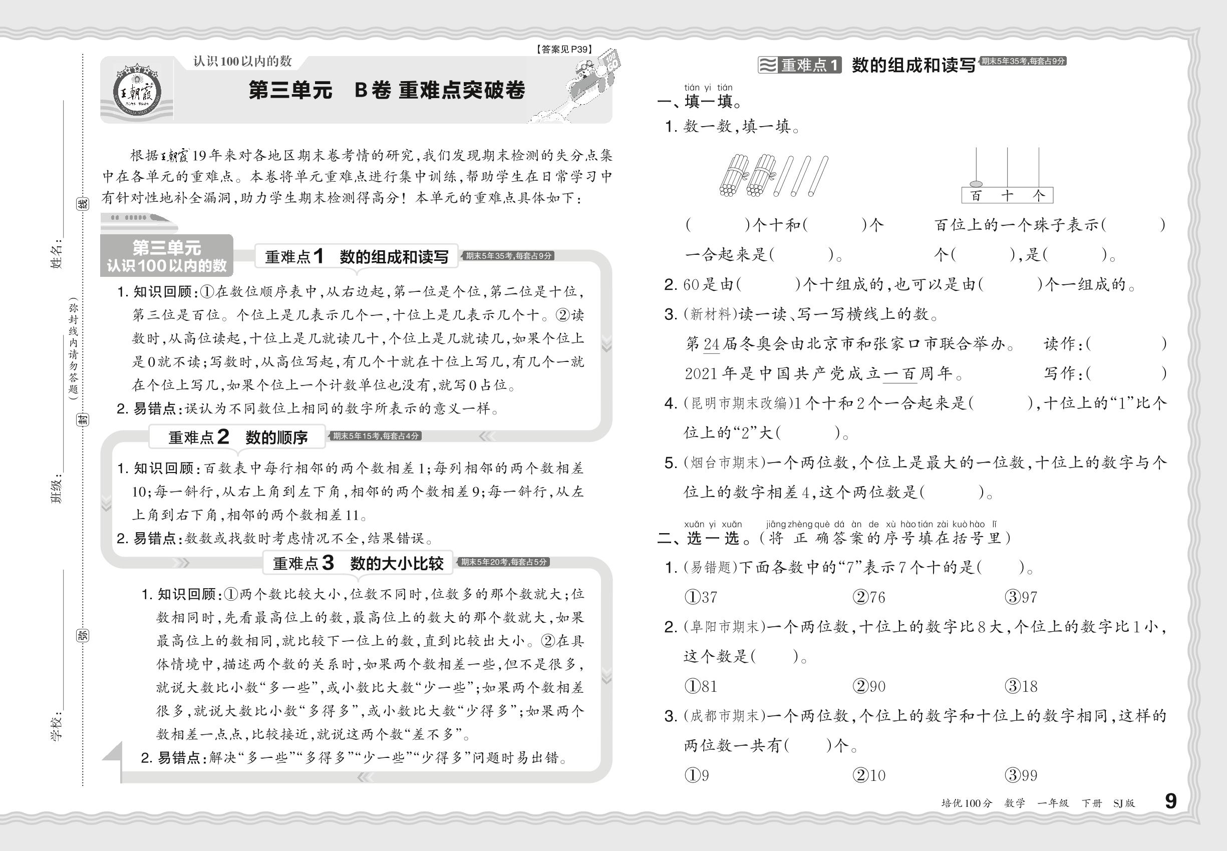 2024春下册一年级数学苏教版 第三单元 B卷 重难点突破卷