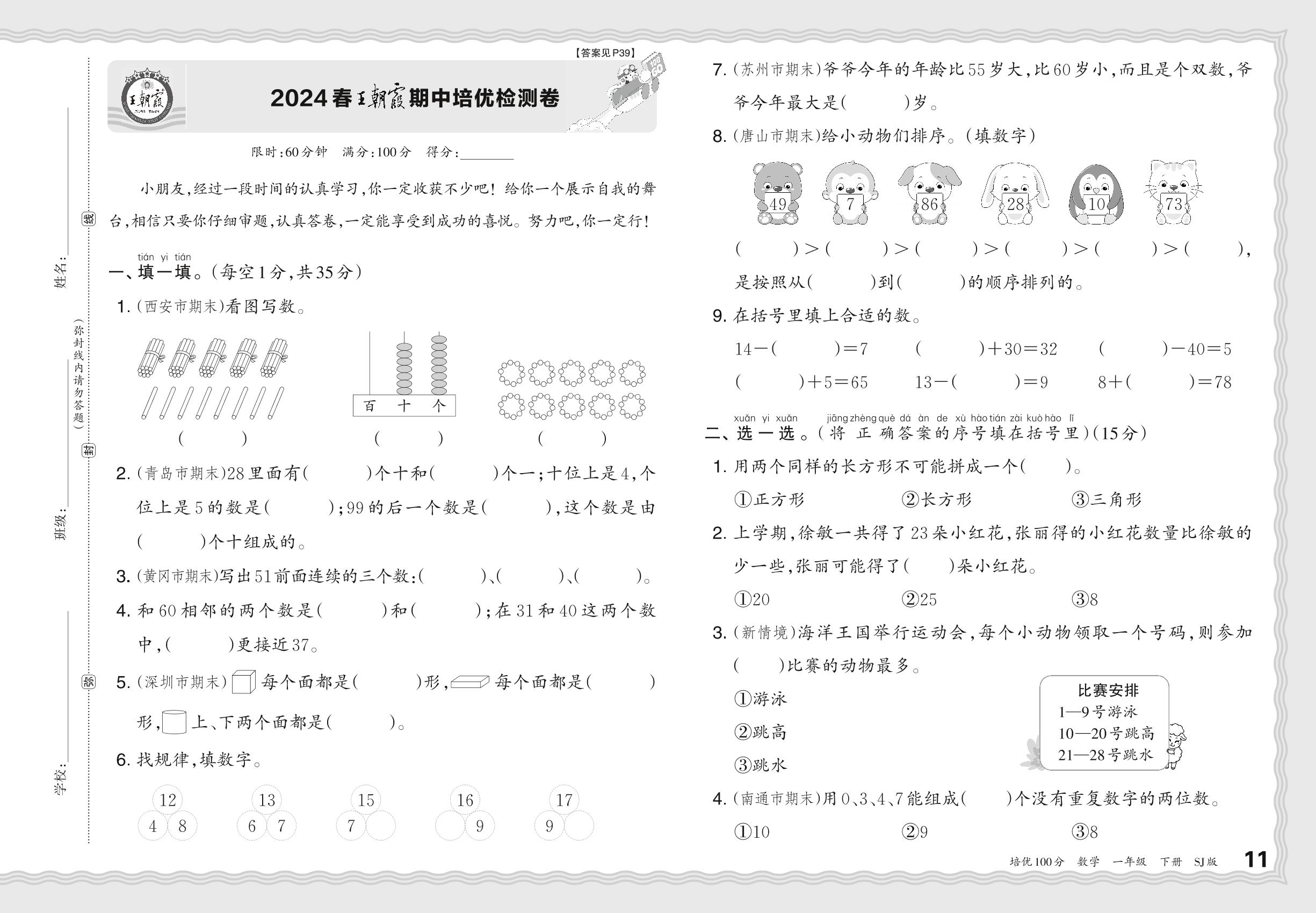 2024春下册一年级数学苏教版 王朝霞期中培优检测卷