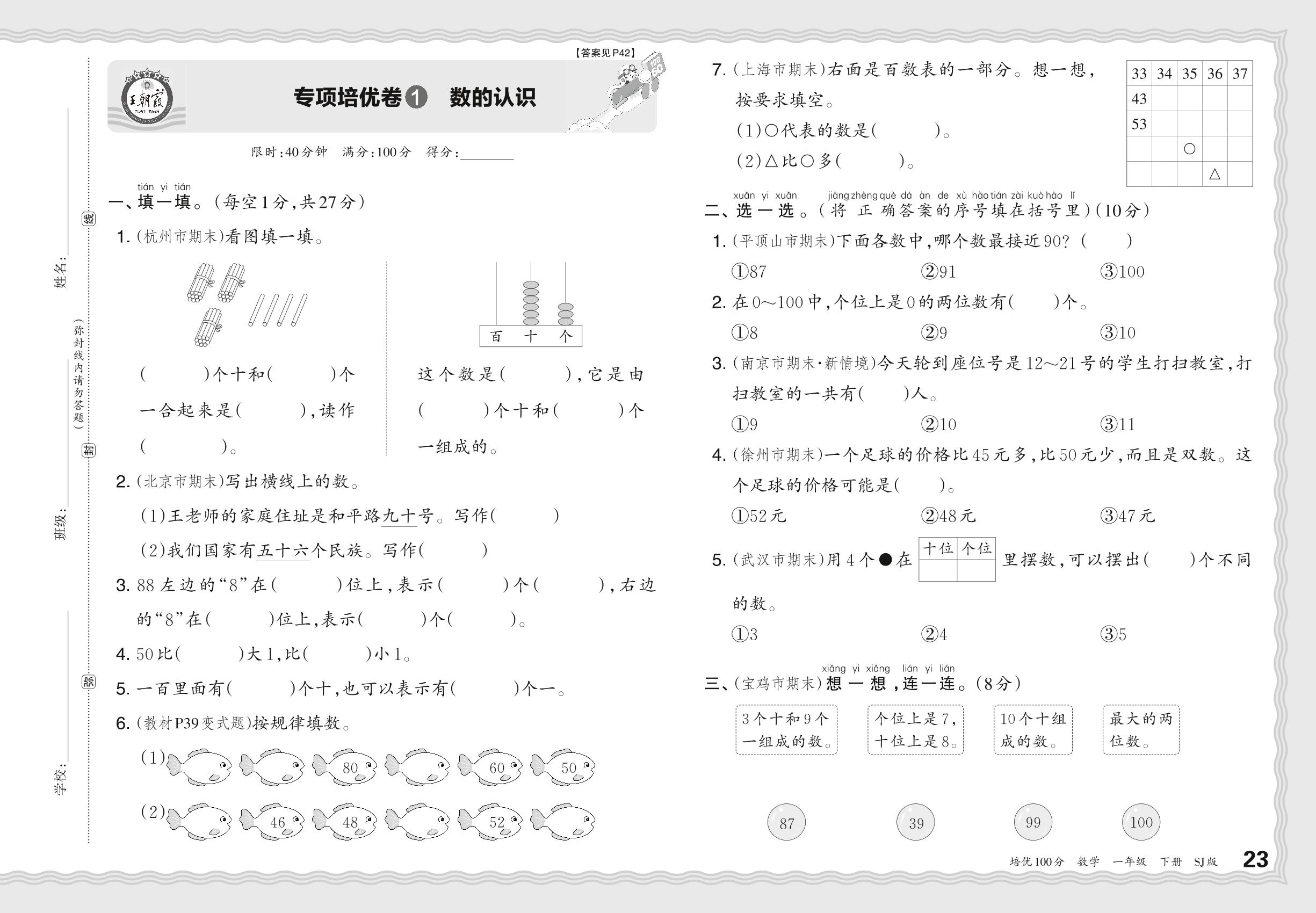一年级数学苏教版下册专项卷
