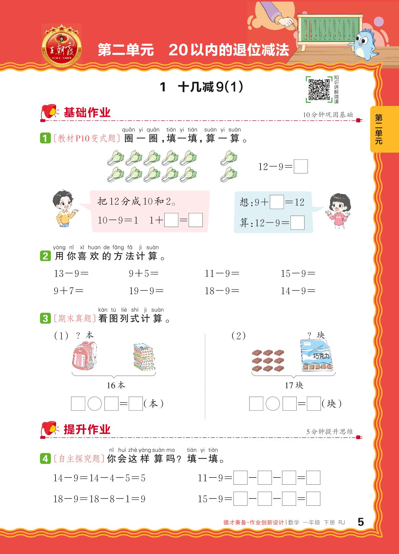 2024春下册一年级数学人教版 第二单元 20以内的退位减法——1. 十几减9(1)