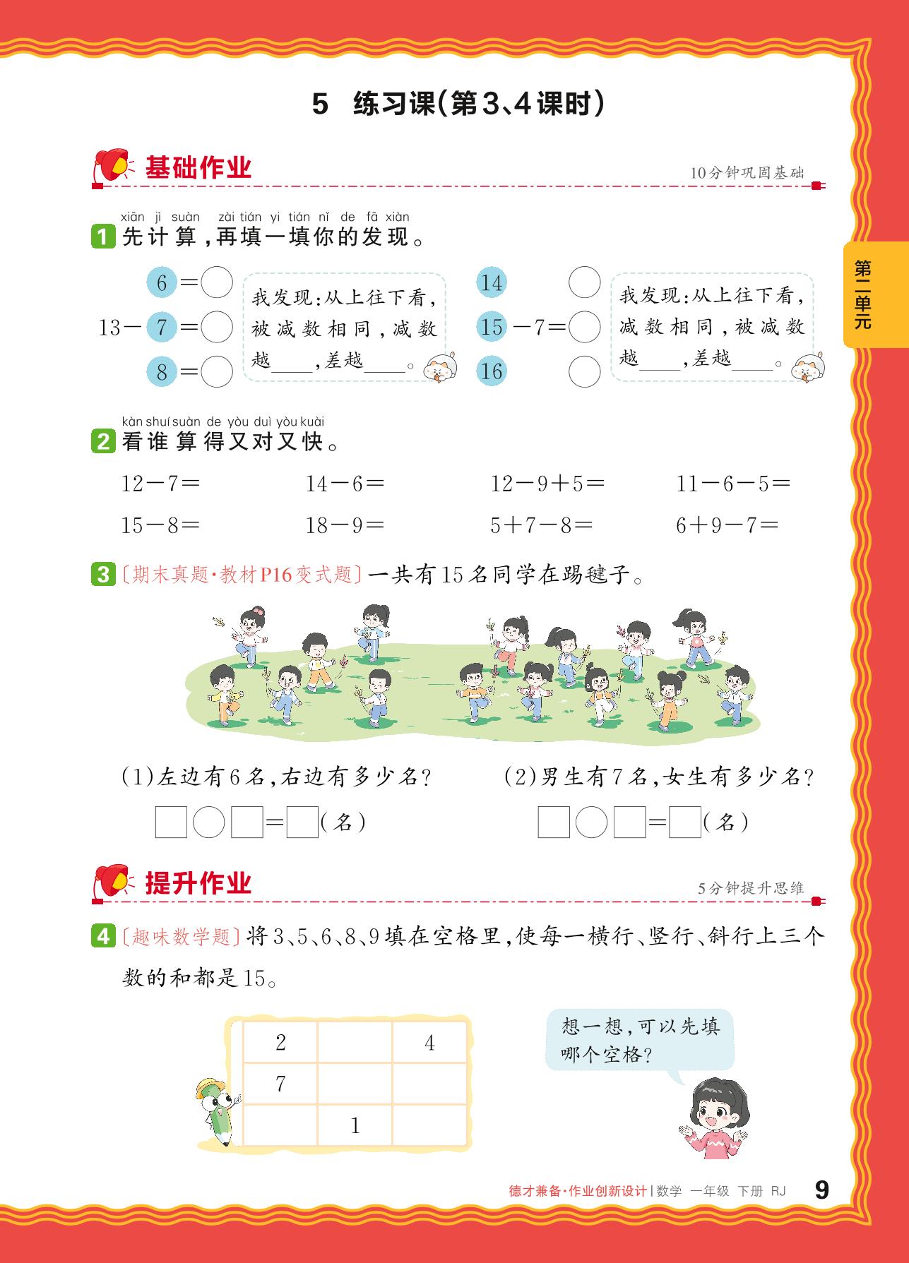 2024春下册一年级数学人教版 第二单元 20以内的退位减法——5. 十几减8 十几减7、6练习课