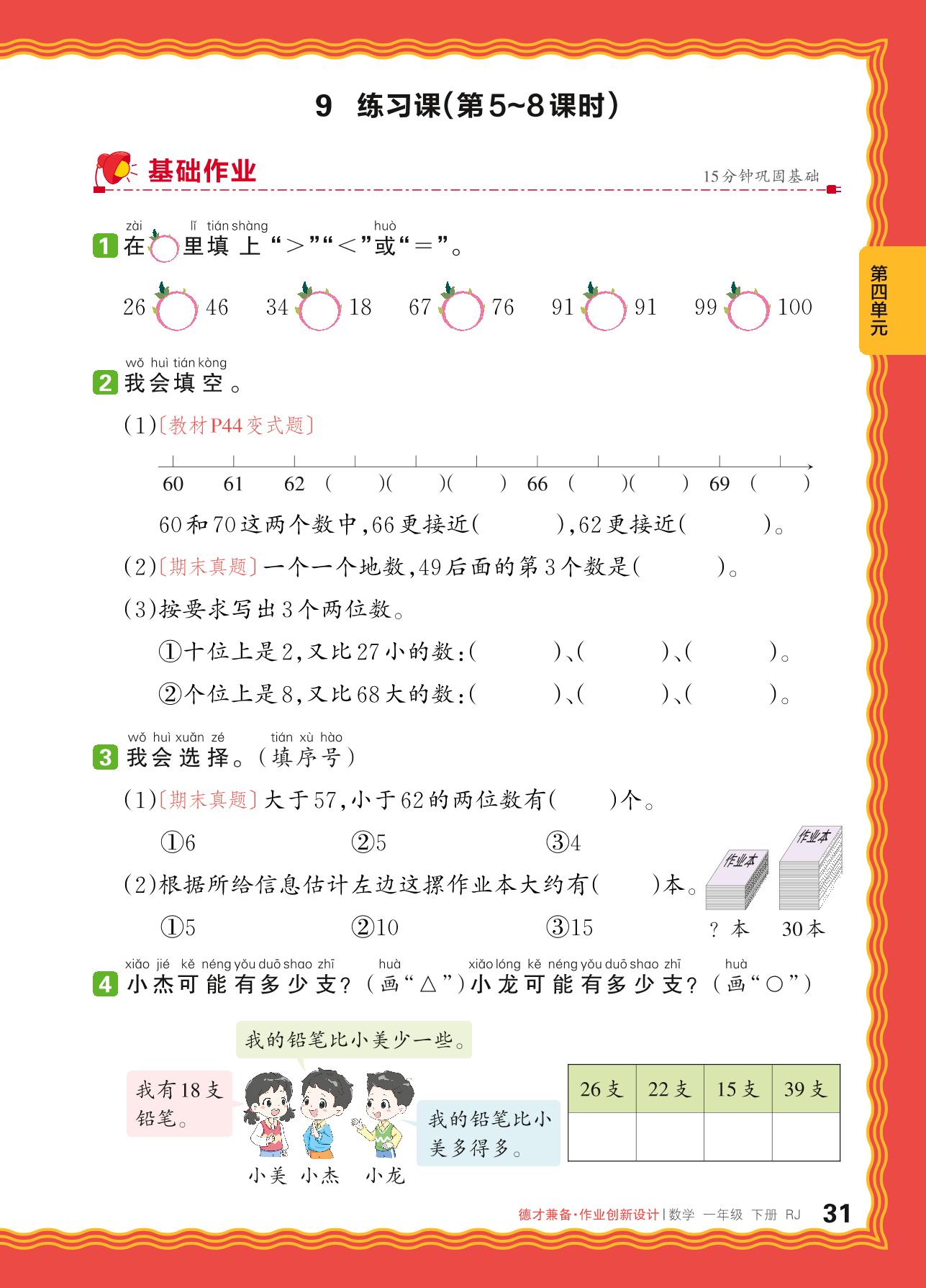 2024春下册一年级数学人教版 第四单元 100以内数的认识——9. 数的顺序、比较大小、解决问题练习课
