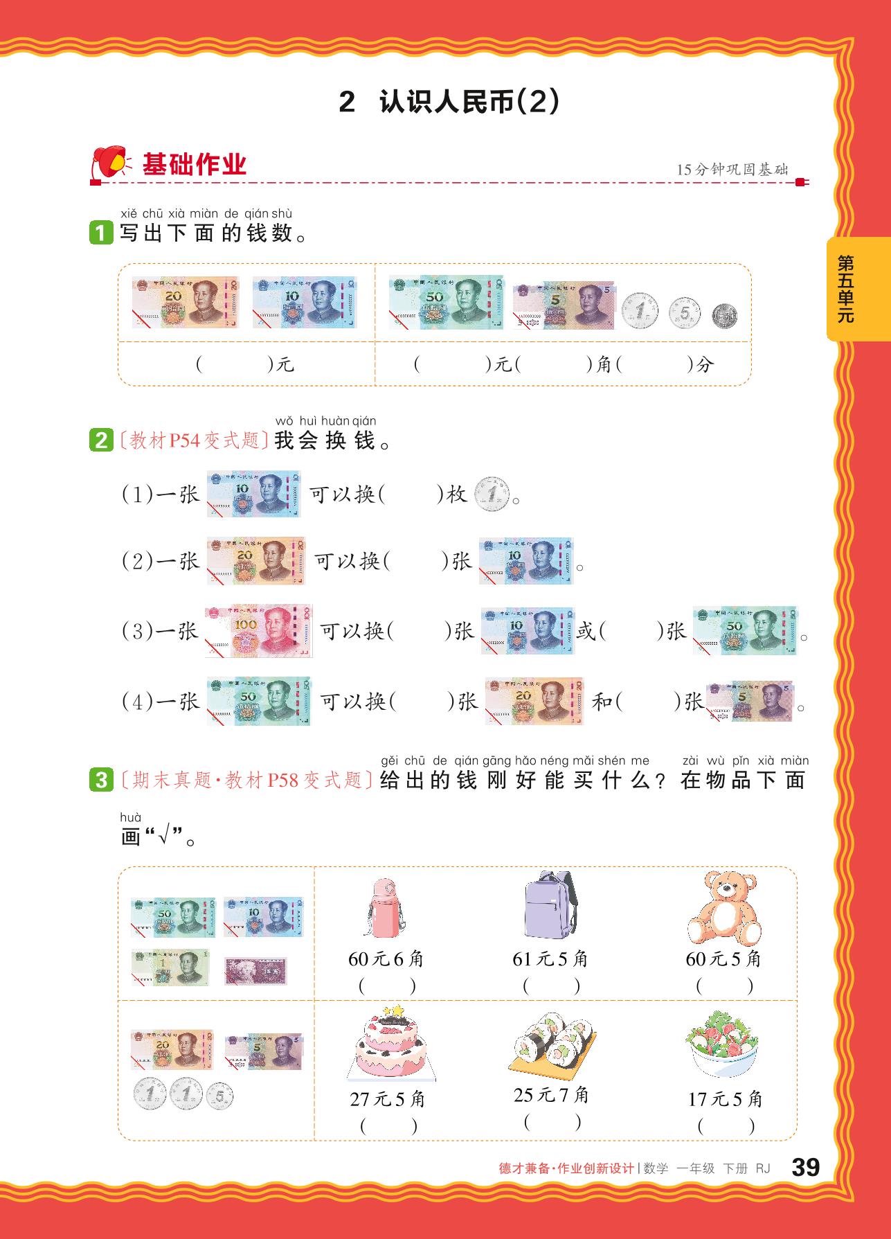 2024春下册一年级数学人教版 第五单元 认识人民币——2. 认识人民币(2)
