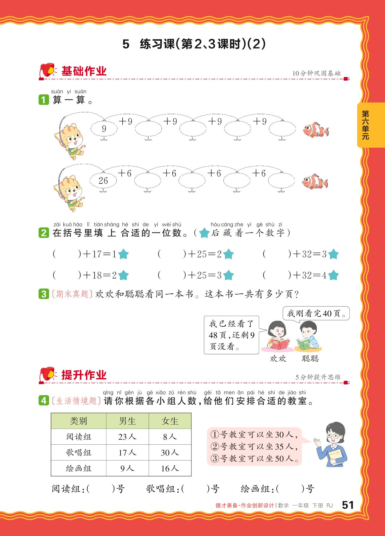 2024春下册一年级数学人教版 第六单元 100以内的加法和减法(一)——5. 两位数加一位数、整十数练习课(2)