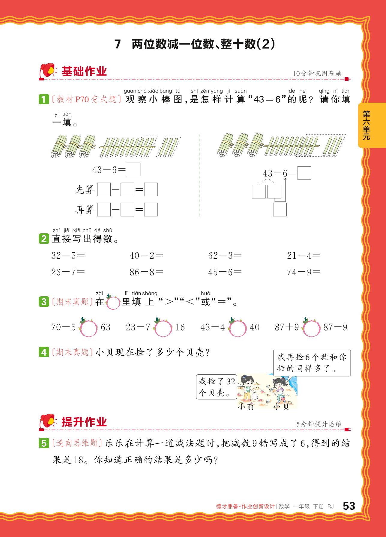 2024春下册一年级数学人教版 第六单元 100以内的加法和减法(一)——7. 两位数减一位数、整十数(2)