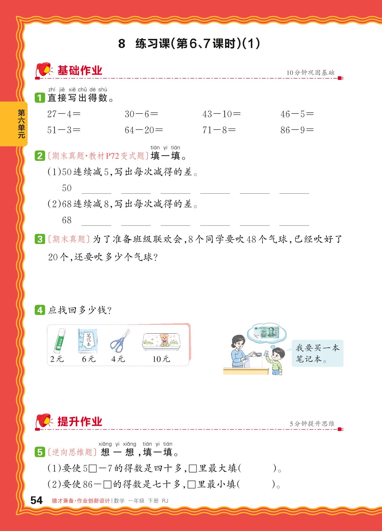 2024春下册一年级数学人教版 第六单元 100以内的加法和减法(一)——8. 两位数减一位数、整十数练习课(1)