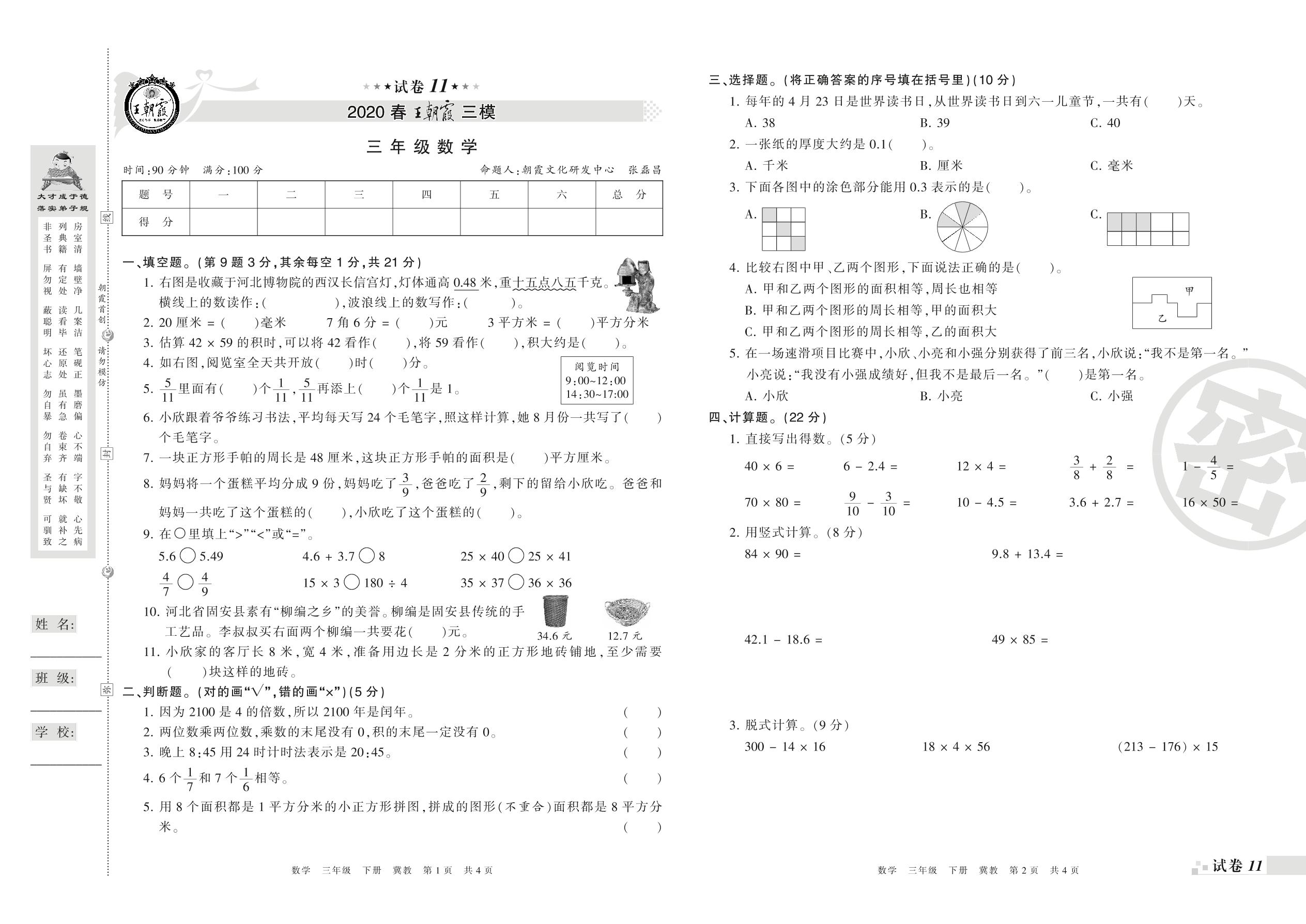 王朝霞期末模拟卷三年级下册数学(冀教版)_R21080494155【11】
