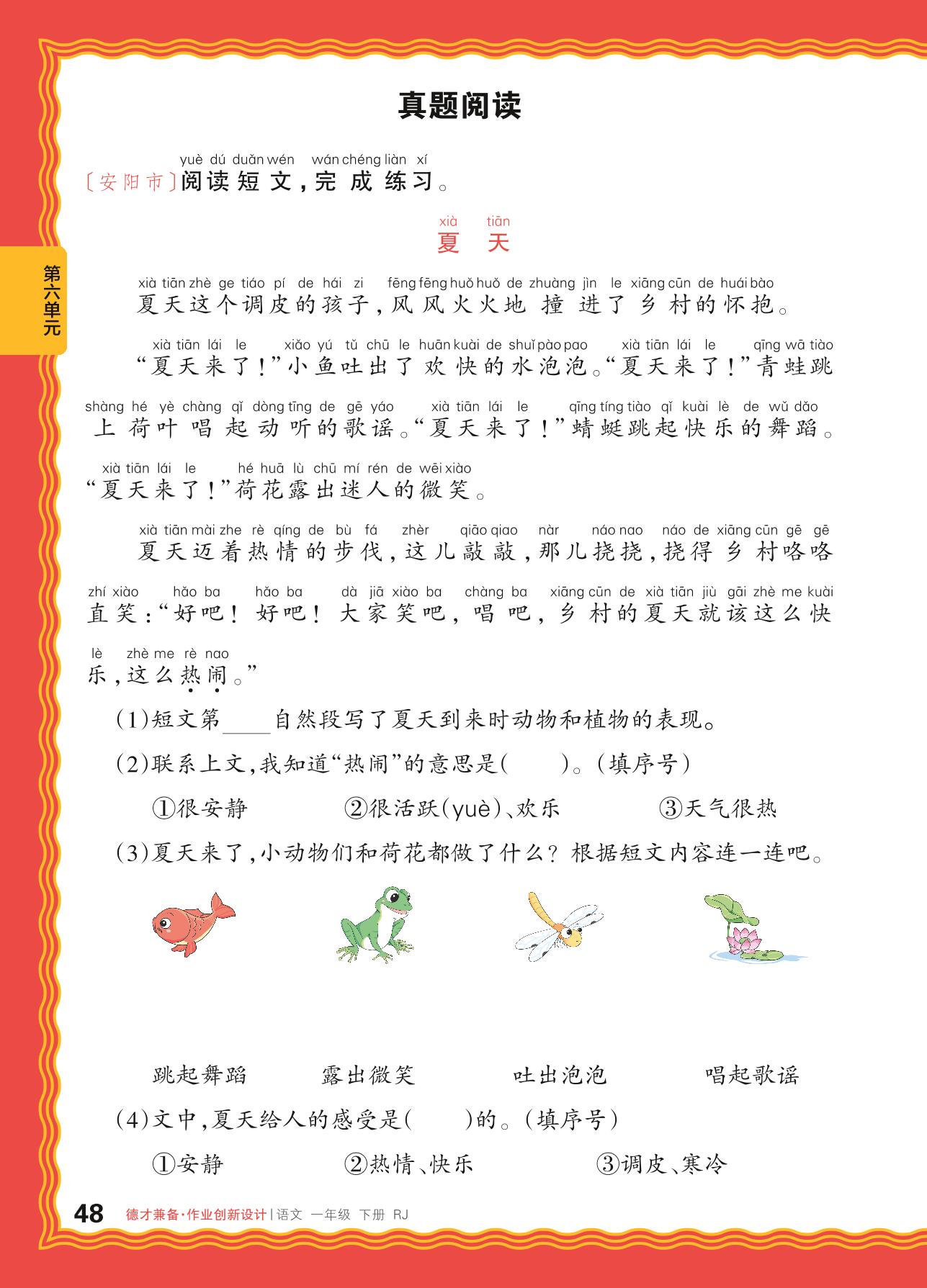 2024春下册一年级语文人教版 第六单元 夏天——真题阅读