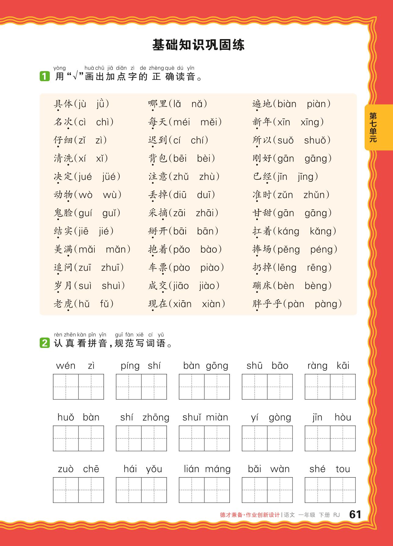 2024春下册一年级语文人教版 第七单元 习惯——基础知识巩固练