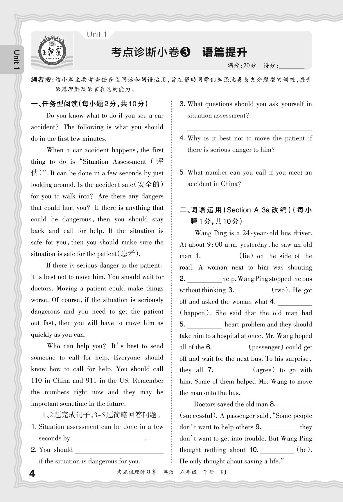 2024春下册八年级英语人教版 Unit 1 考点诊断小卷3 语篇提升