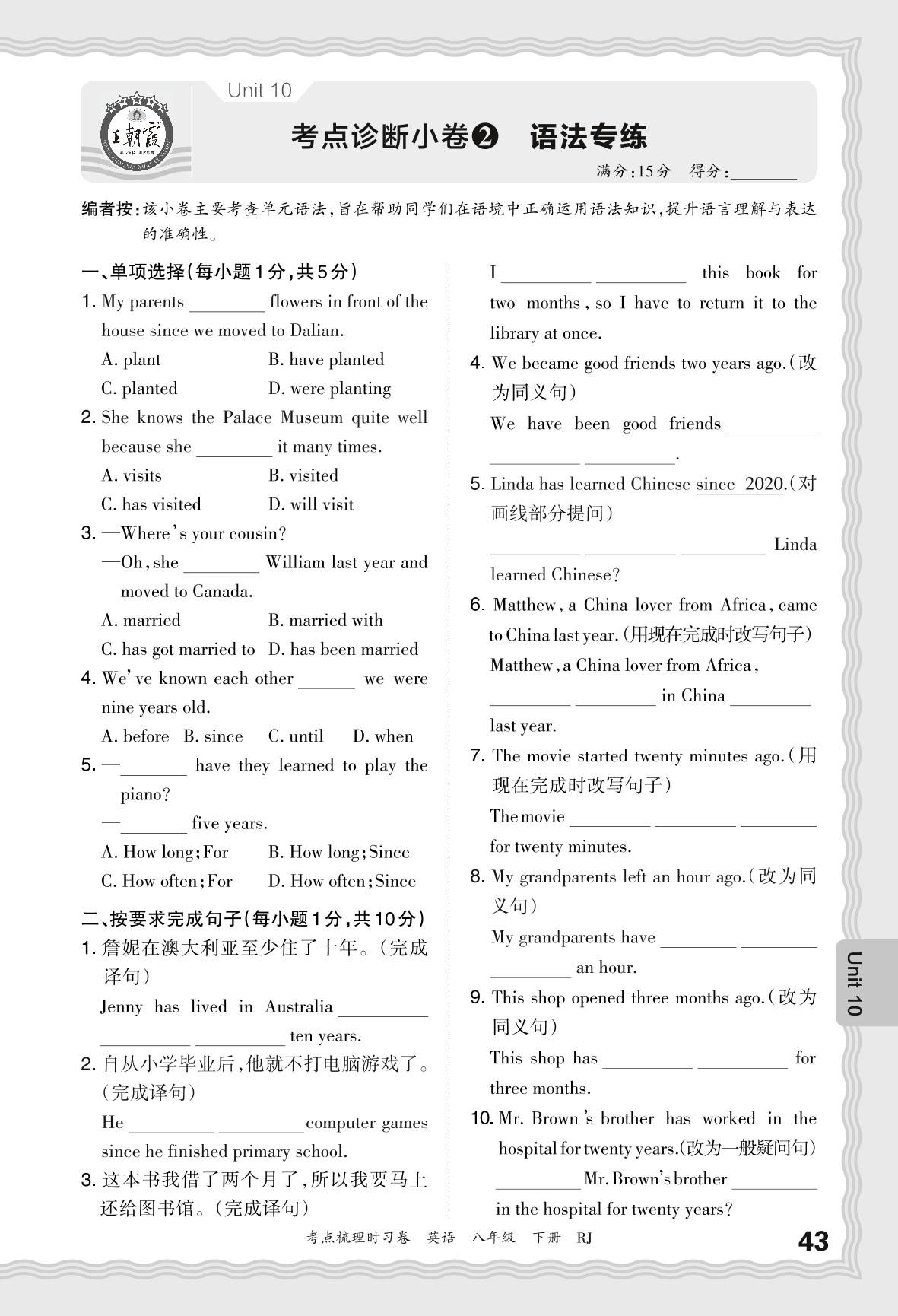 2024春下册八年级英语人教版 Unit 10 考点诊断小卷2 语法专练