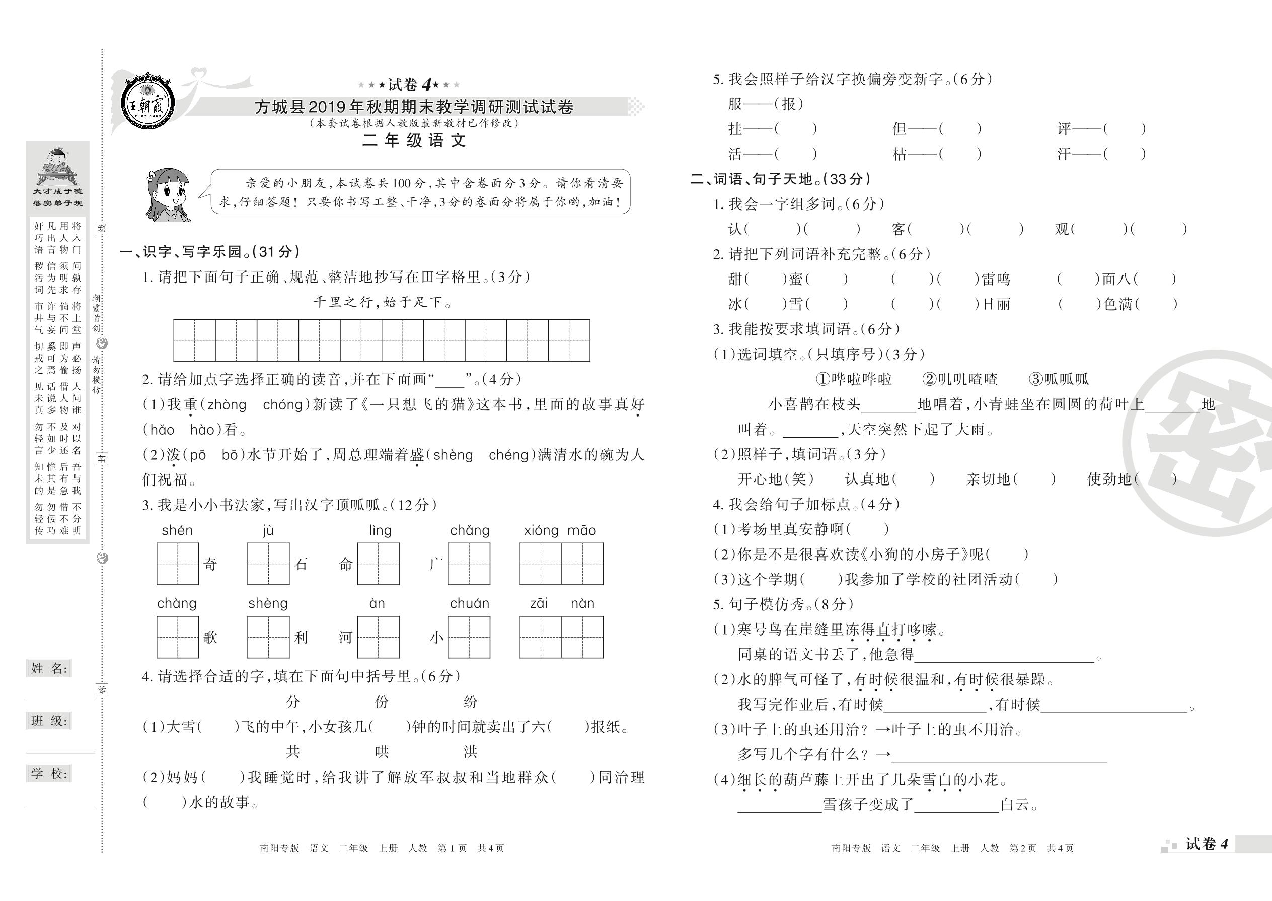 2019-2020学年第一学期南阳市方城县二年级语文试卷(人教版)【4】