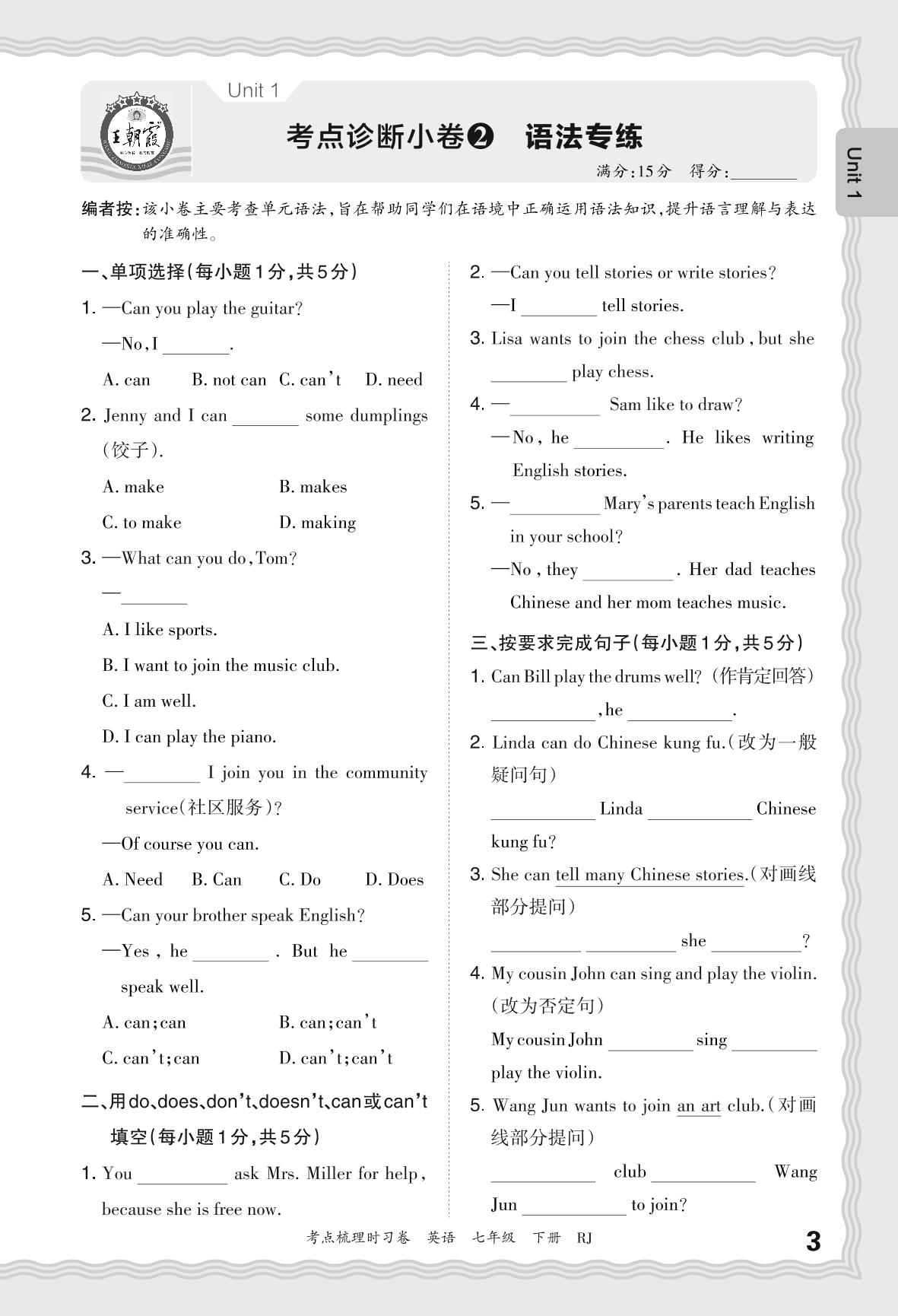 2024春下册七年级英语人教版 Unit 1 考点诊断小卷2 语法专练