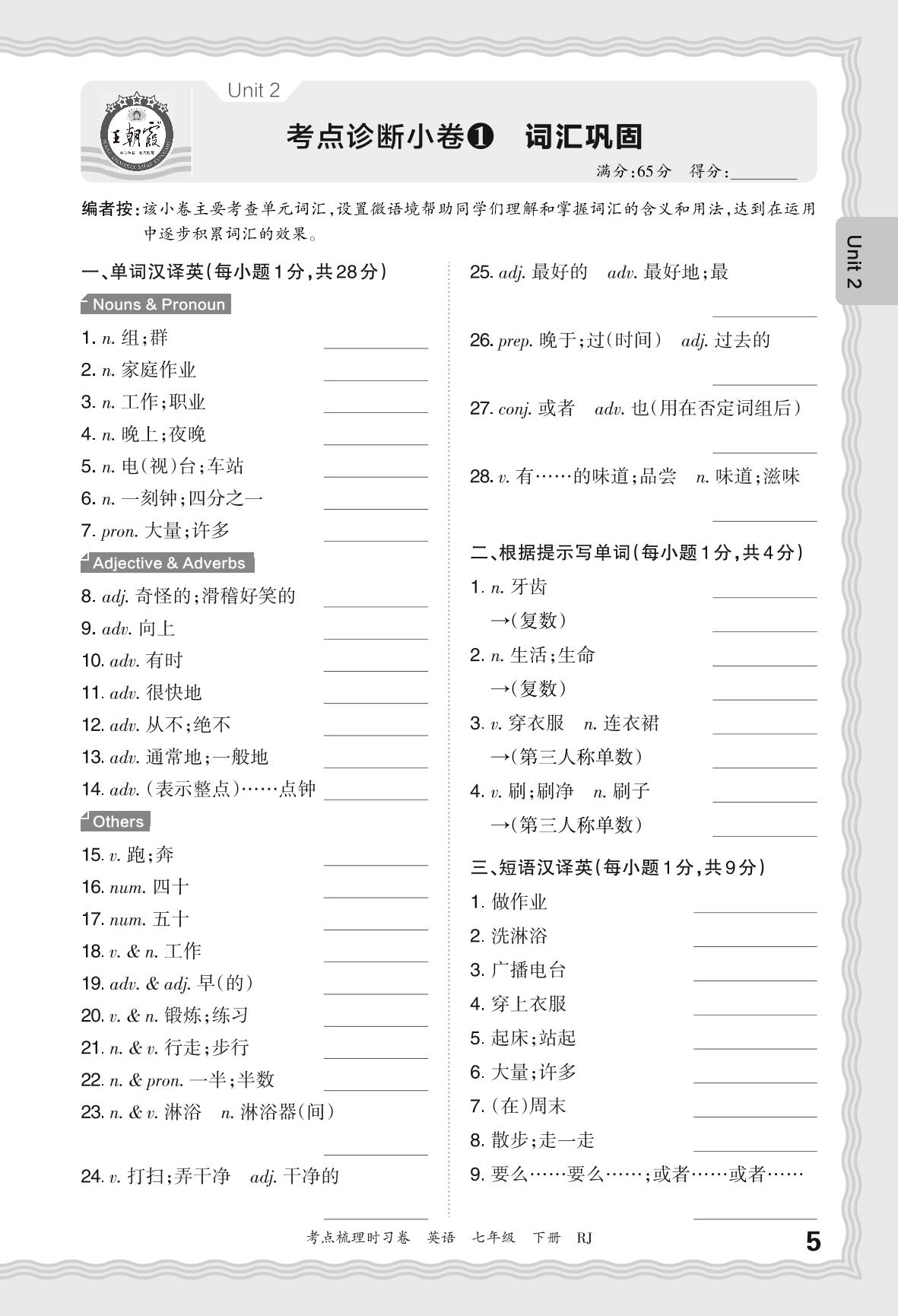 2024春下册七年级英语人教版 Unit 2 考点诊断小卷1 词汇巩固