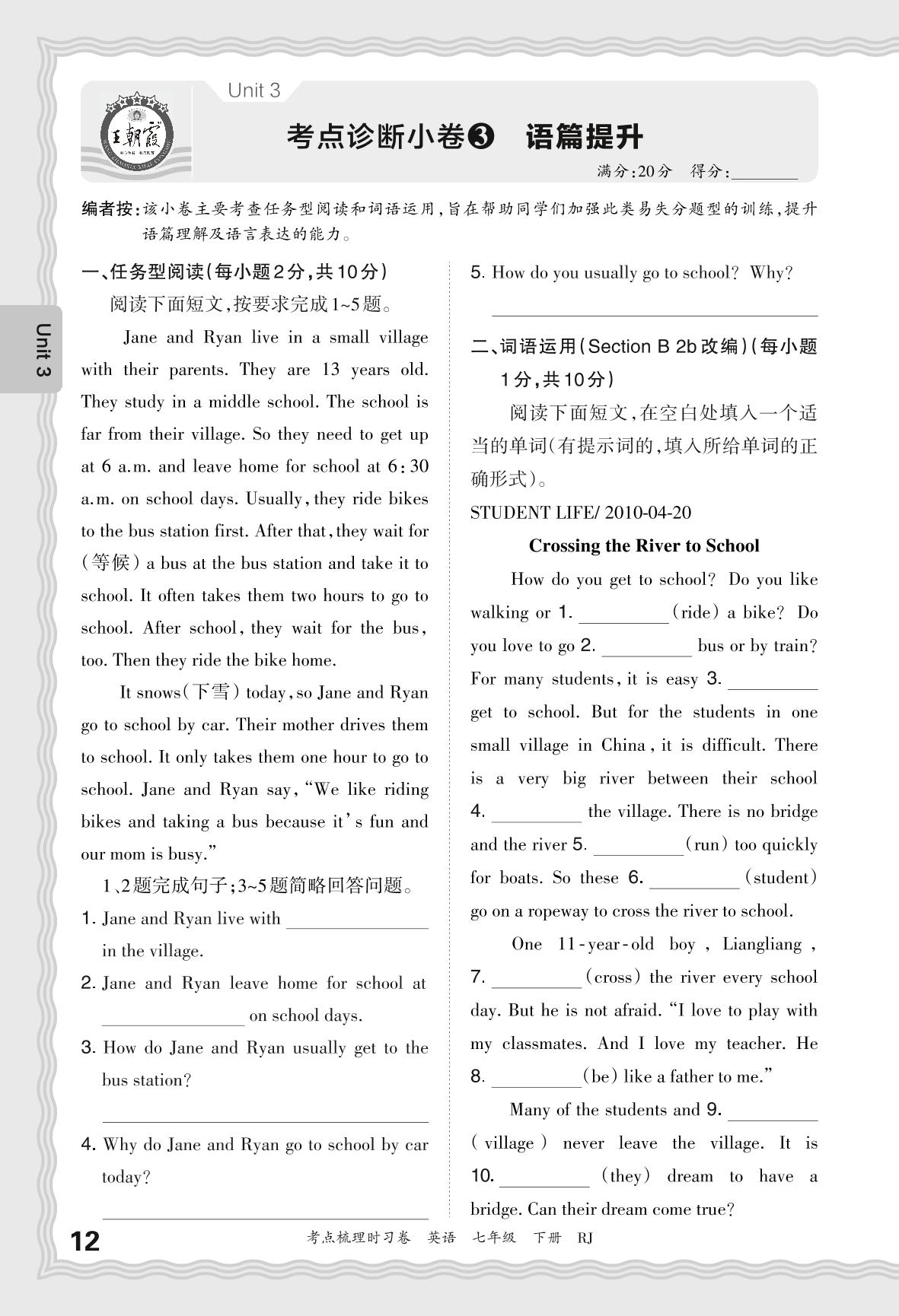 2024春下册七年级英语人教版 Unit 3 考点诊断小卷3 语篇提升