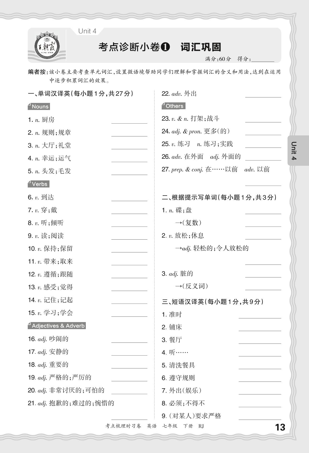 2024春下册七年级英语人教版 Unit 4 考点诊断小卷1 词汇巩固
