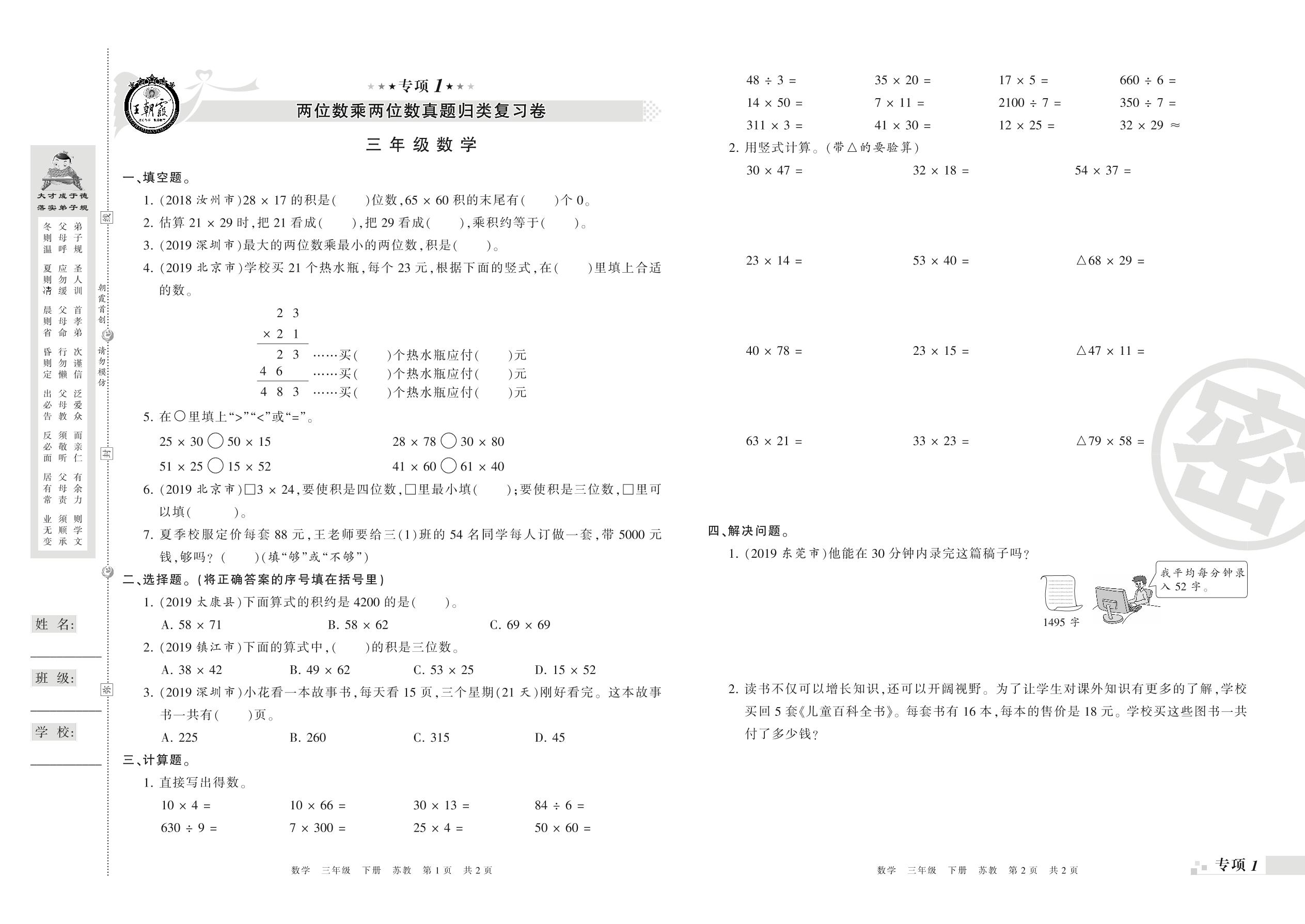 王朝霞期末专项卷——两位数乘两位数、混合运算真题归类复习卷三年级下册数学(苏教版)_R21080494253【0】