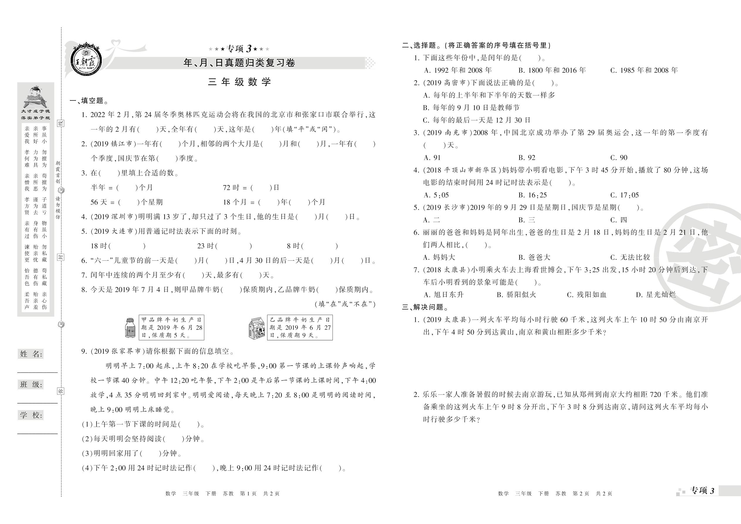 王朝霞期末专项卷——年、月、日、长方形和正方形的面积真题归类复习卷三年级下册数学(苏教版)_R21080494255【0】