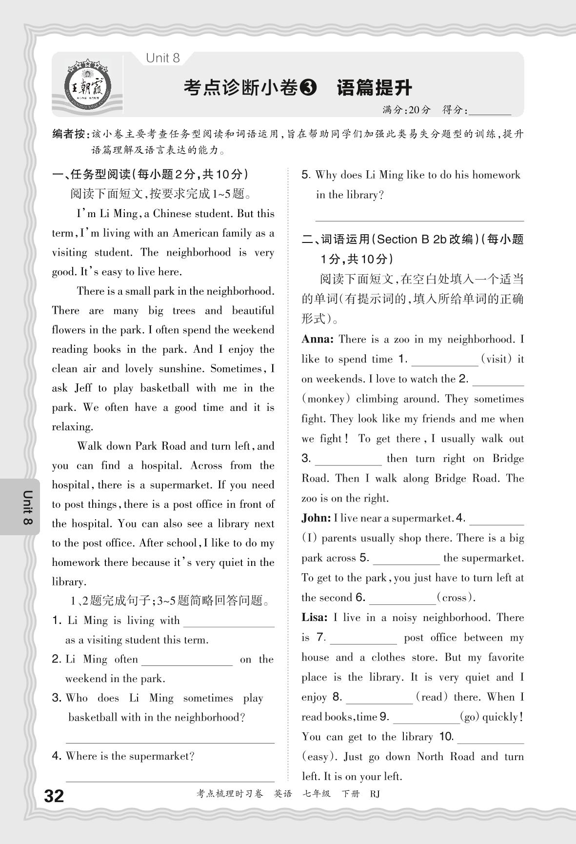 2024春下册七年级英语人教版 Unit 8 考点诊断小卷3 语篇提升