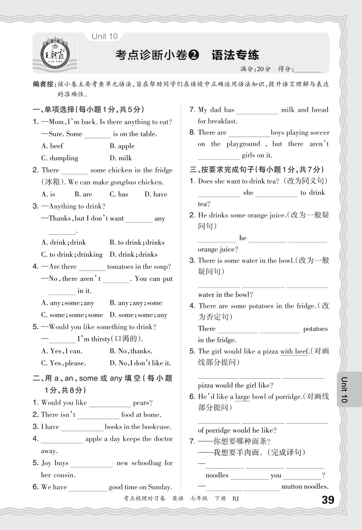 2024春下册七年级英语人教版 Unit 10 考点诊断小卷2 语法专练