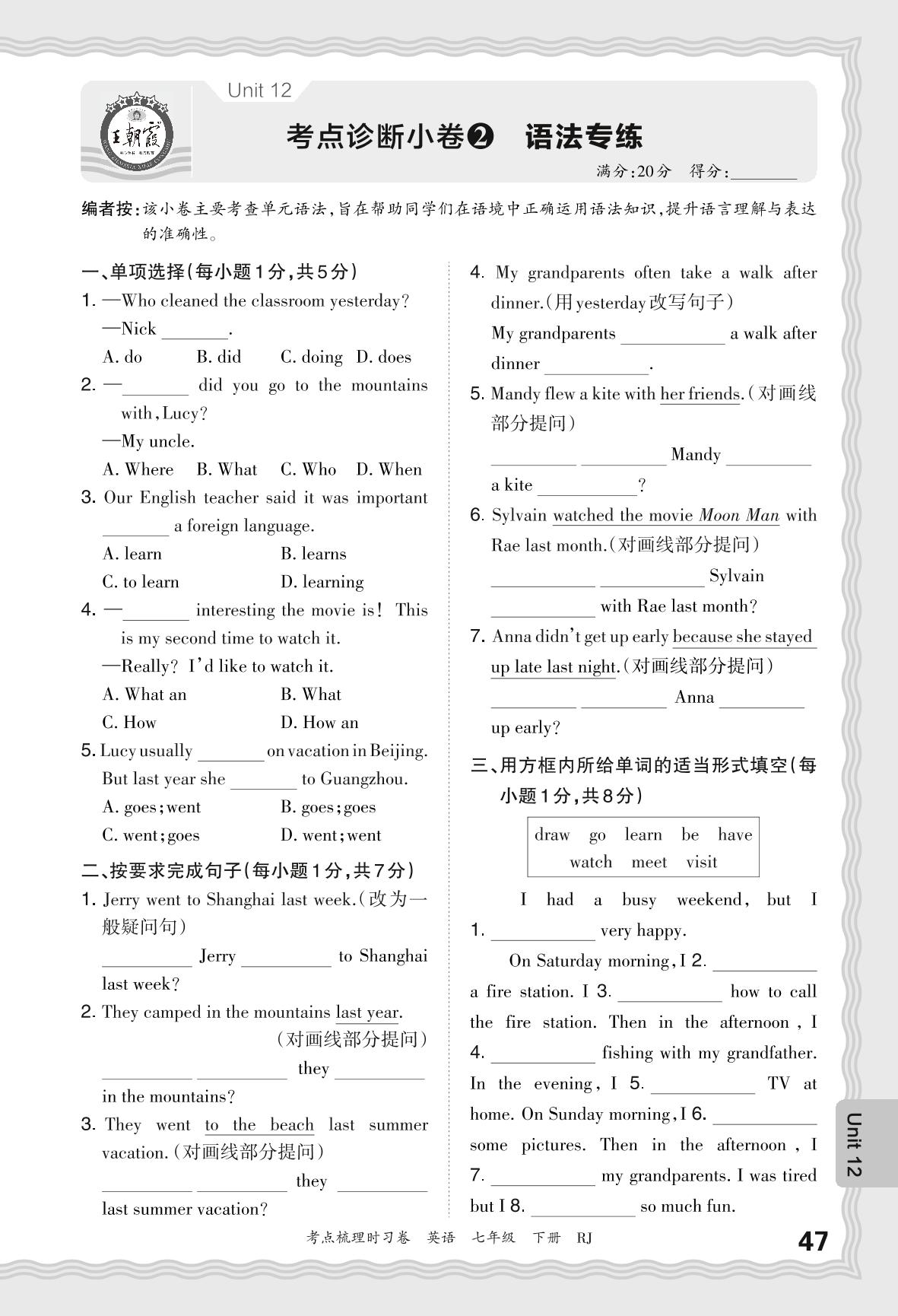 2024春下册七年级英语人教版 Unit 12 考点诊断小卷2 语法专练