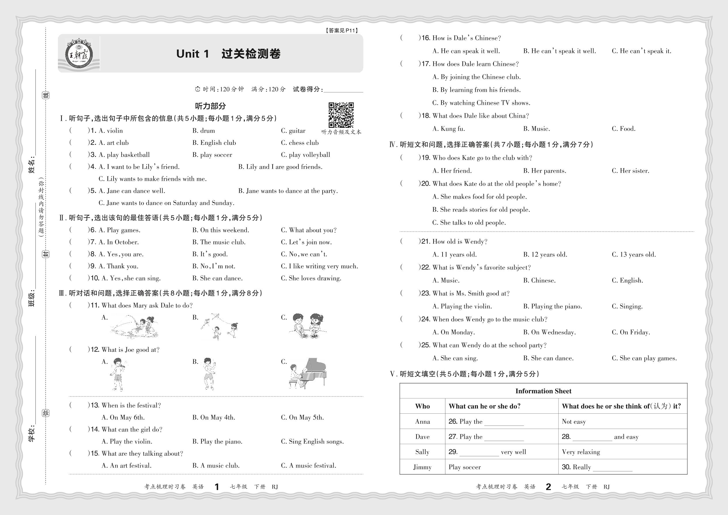 2024春下册七年级英语人教版 Unit 1 过关检测卷