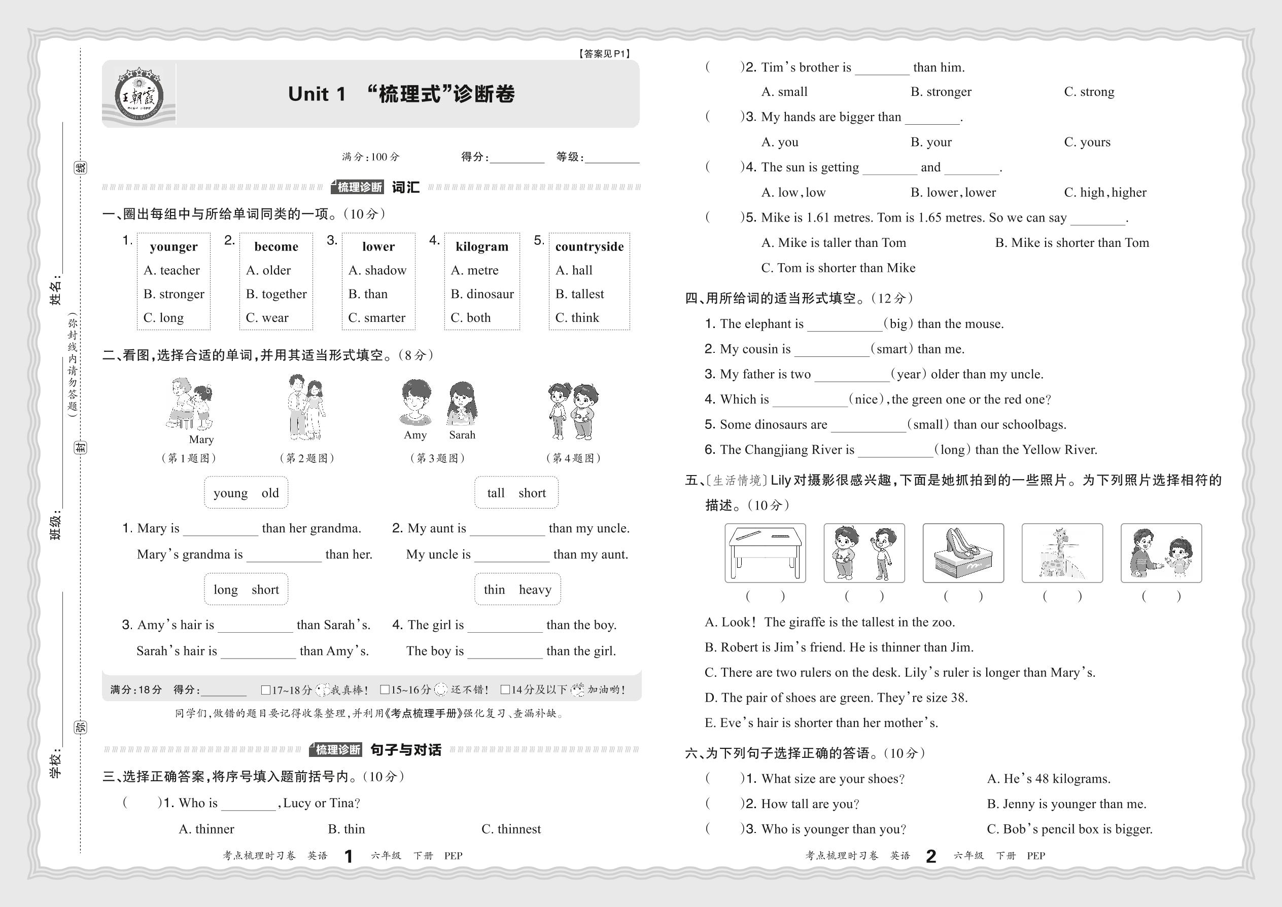 2024春下册六年级英语人教PEP版 Unit 1 “梳理式”诊断卷