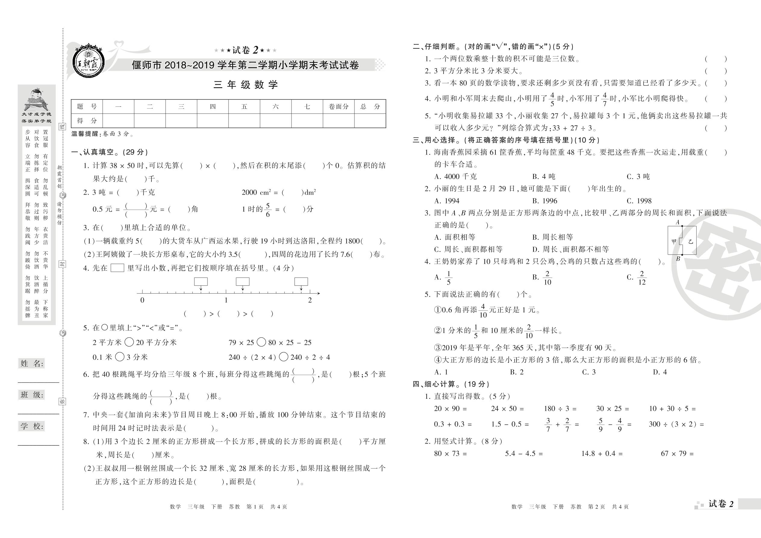2018-2019学年第二学期偃师市三年级数学试卷(苏教版)【2】