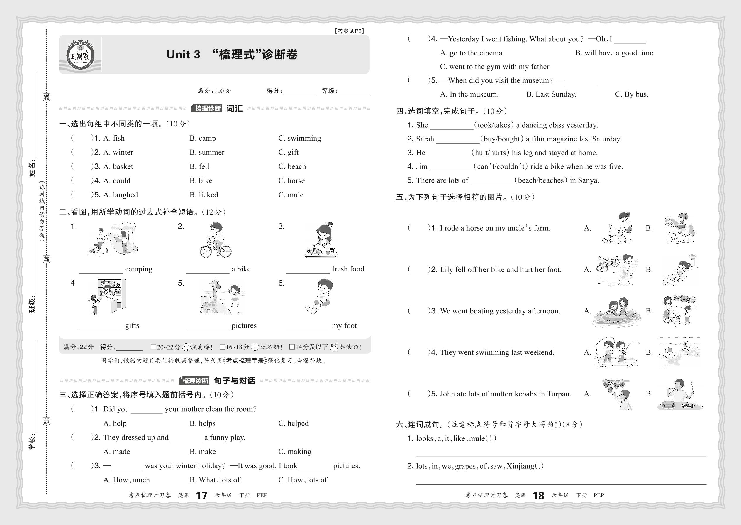 2024春下册六年级英语人教PEP版 Unit 3 “梳理式”诊断卷